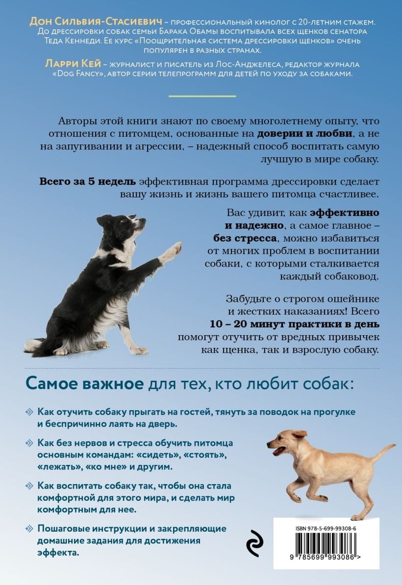 Отношения с питомцем, основанные на доверии и любви, а не на запугивании и агрессии – надежный способ воспитать самую лучшую в мире собаку. Автор книги Дон Сильвия-Стасиевич дрессировала четвероногих друзей представителей Белого дома – Барака Обамы и Теда Кеннеди. Эффективность пятинедельной программы дрессировки проверена на многолетней практике. Занимаясь всего по 10-20 минут в день можно научить питомца основным командам, избавить щенка или взрослую собаку от вредных привычек, с которыми сталкивается большинство владельцев. Изучив поощрительную систему дрессировки, вы сможете воспитать лучшую собаку в мире. И для этого вам не понадобится строгий ошейник, удавка или строгие выговоры.