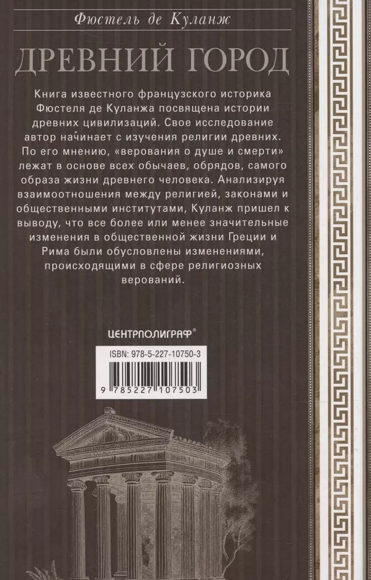 Книга известного французского историка Фюстеля де Куланжа посвящена истории древних цивилизаций. Свое исследование автор начинает с изучения религии древних. По его мнению, «верования о душе и смерти» лежат в основе всех обычаев, обрядов, самого образа жизни древнего человека. Анализируя взаимоотношения между религией, законами и общественными институтами, Куланж пришел к выводу, что все более или менее значительные изменения в общественной жизни Греции и Рима были обусловлены изменениями, происходящими в сфере религиозных верований.