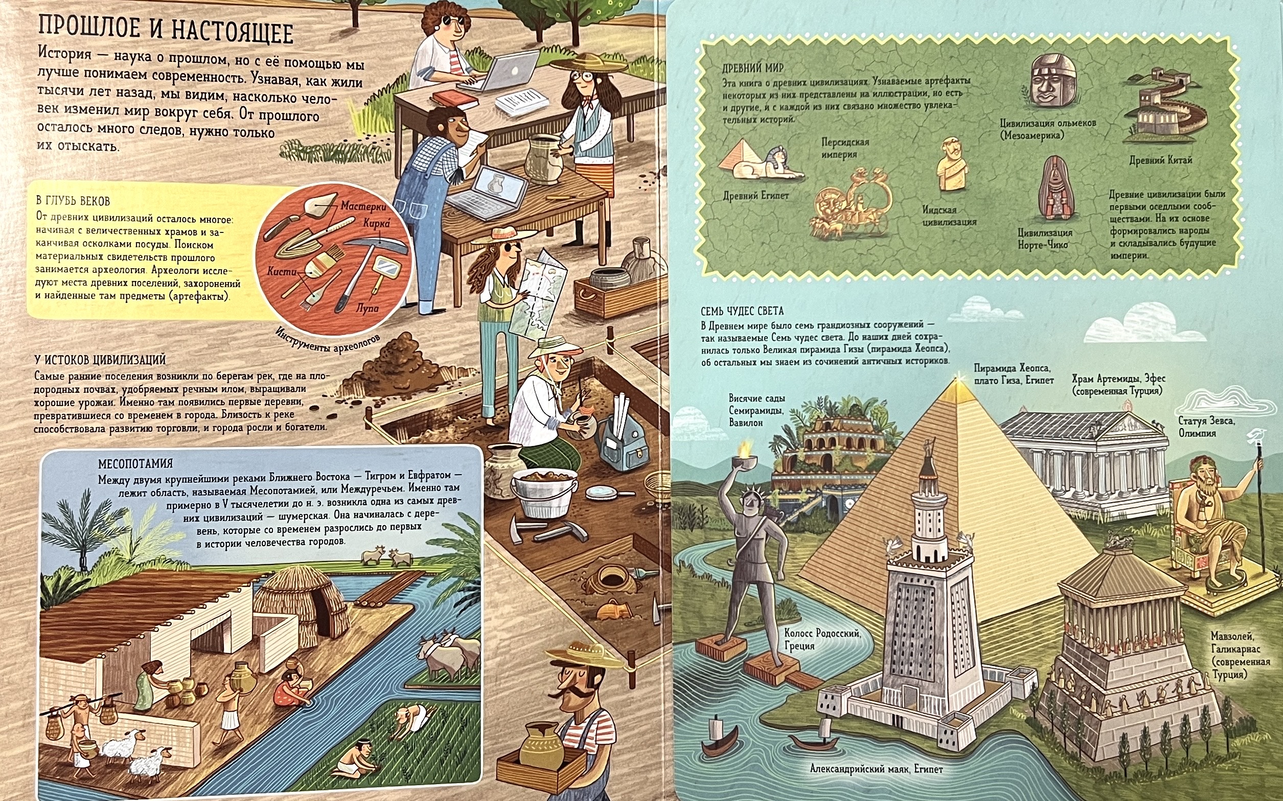 Открой книгу - и ты перенесёшься на раскопки древнего города, найдёшь артефакты с тысячелетней историей, рассмотришь на камне и папирусе слова исчезнувших языков и представишь, как жили люди много веков назад. В картонных «окошках» есть немало любопытного: минойские дворцы и римские термы, мумии и узелковое письмо, драгоценные клады и хитроумные механизмы древних! Для детей 6-10 лет.