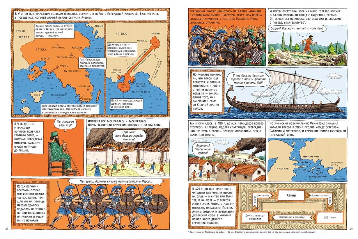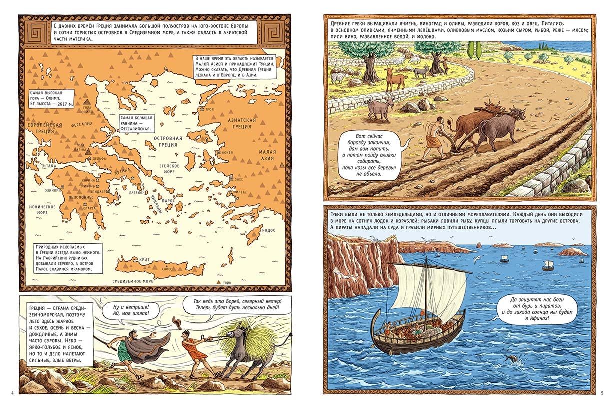 Комикс, посвященный истории Древней Греции от минойцев до Александра Македонского. Автор комикса, французская писательница Доминик Жоли, легко и динамично, простым языком, в увлекательной форме рассказывает о великой греческой цивилизации: о религии и обычаях древних греков, о зарождении и расцвете культуры и искусства, науки и ремесел. Основную информацию дополняют и оживляют забавные иллюстрации художника Эммануэля Оливье и шутливые диалоги героев того или иного эпизода.