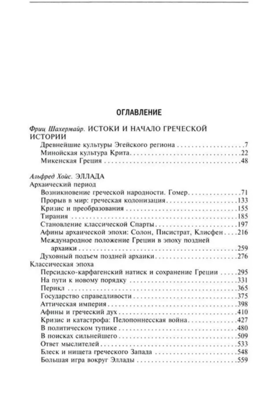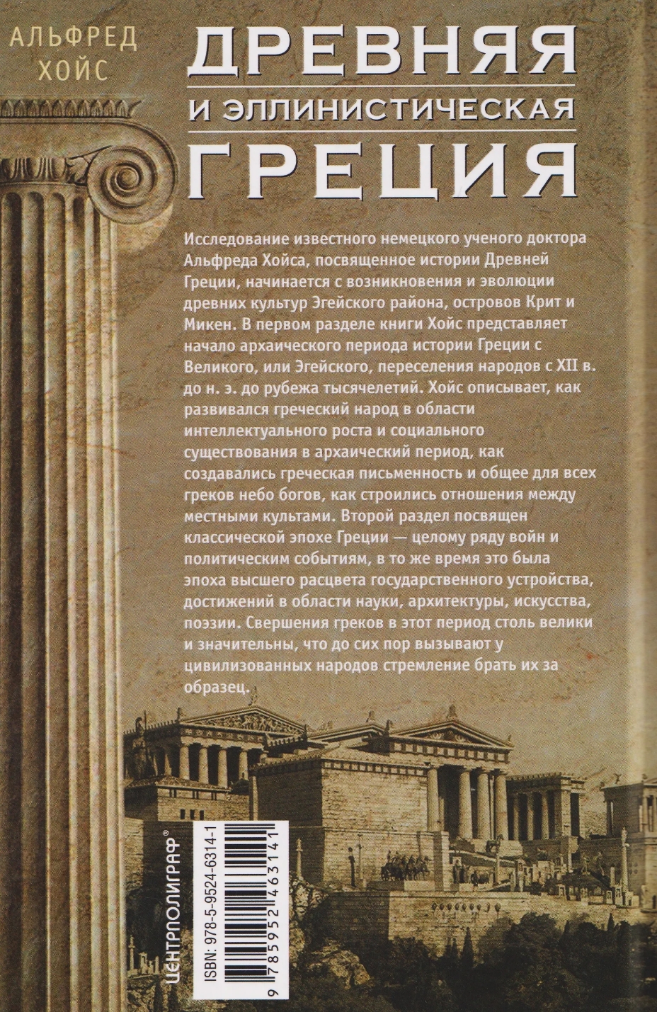 Исследование известного немецкого ученого доктора Альфреда Хойса, посвященное истории Древней Греции, начинается с возникновения и эволюции древних культур Эгейского района, островов Крит и Микен. В первом разделе книги Хойс представляет начало архаического периода истории Греции с Великого, или Эгейского, переселения народов с ХII в. до н. э. до рубежа тысячелетий. Хойс описывает, как развивался греческий народ в области интеллектуального роста и социального существования в архаический период, как создавались греческая письменность и общее для всех греков небо богов, как строились отношения между местными культами. Второй раздел посвящен классической эпохе Греции - целому ряду войн и политическим событиям, в то же время это была эпоха высшего расцвета государственного устройства, достижений в области науки, архитектуры, искусства, поэзии. Свершения греков в этот период столь велики и значительны, что до сих пор вызывают у цивилизованных народов стремление брать их за образец.