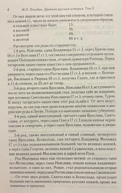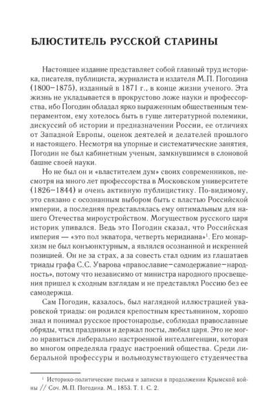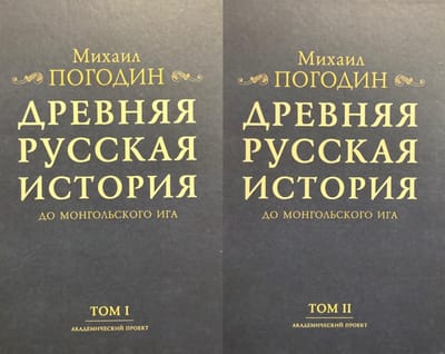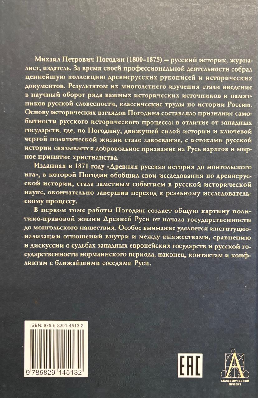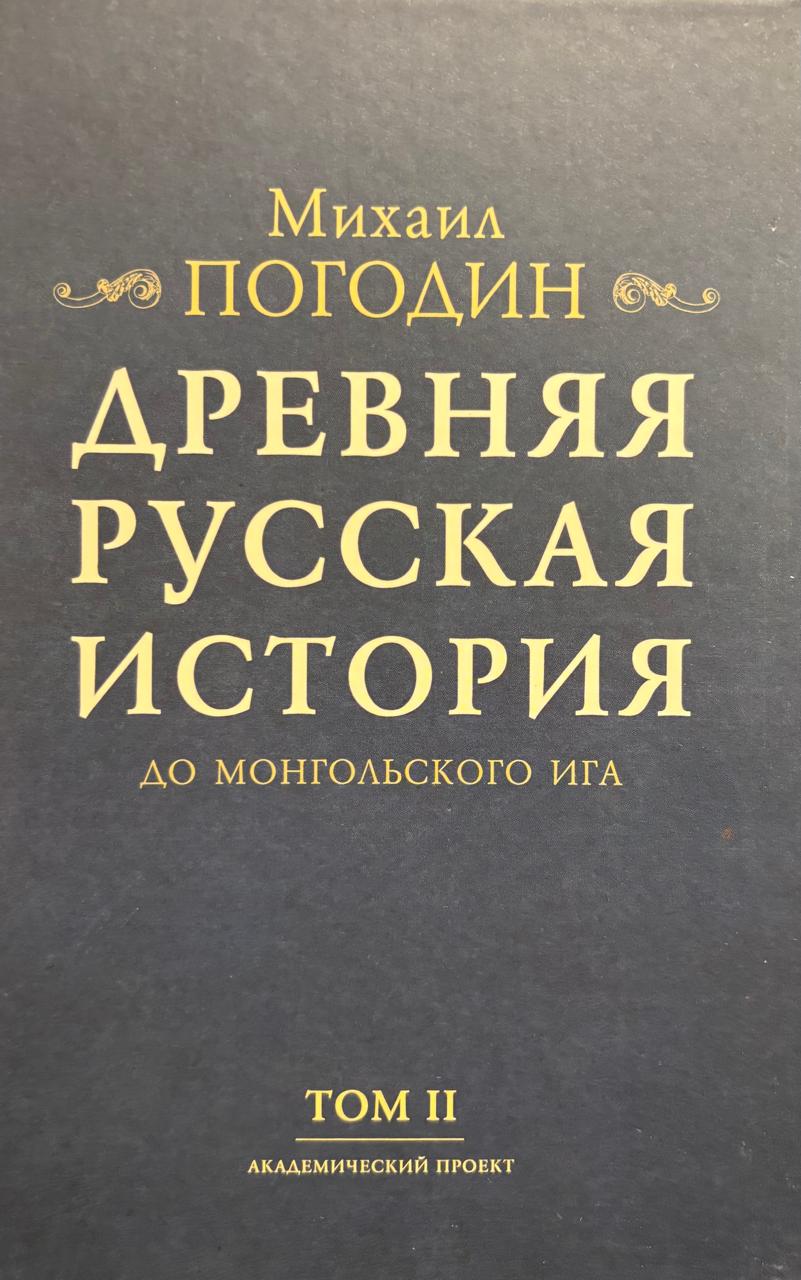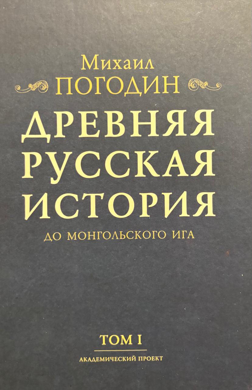 Михаил Петрович Погодин (1800-1875) - русский историк, журналист, издатель. За время своей профессиональной деятельности собрал ценнейшую коллекцию древнерусских рукописей и исторических документов. Результатом их многолетнего изучения стали введение в научный оборот ряда важных исторических источников и памятников русской словесности, классические труды по истории России. Основу исторических взглядов Погодина составляло признание самобытности русского исторического процесса: в отличие от западных государств, где, по Погодину, движущей силой истории и ключевой чертой политической жизни стало завоевание, с истоками русской истории связывается добровольное призвание на Русь варягов и мирное принятие христианства. Изданная в 1871 году «Древняя русская история до монгольского ига», в которой Погодин обобщил свои исследования по древнерусской истории, стала заметным событием в русской исторической науке, окончательно завершив реальный переход к реальному исследовательскому процессу. В первом томе работы Погодин создает общую картину политико-правовой жизни Древней Руси от начала государственности до монгольского нашествия. Особое внимание уделяется институционализации отношений внутри и между княжествами, сравнению и дискуссии о судьбах западных европейских государств и русской государственности норманнского периода, наконец, контактам и конфликтам с ближайшими соседями Руси.
