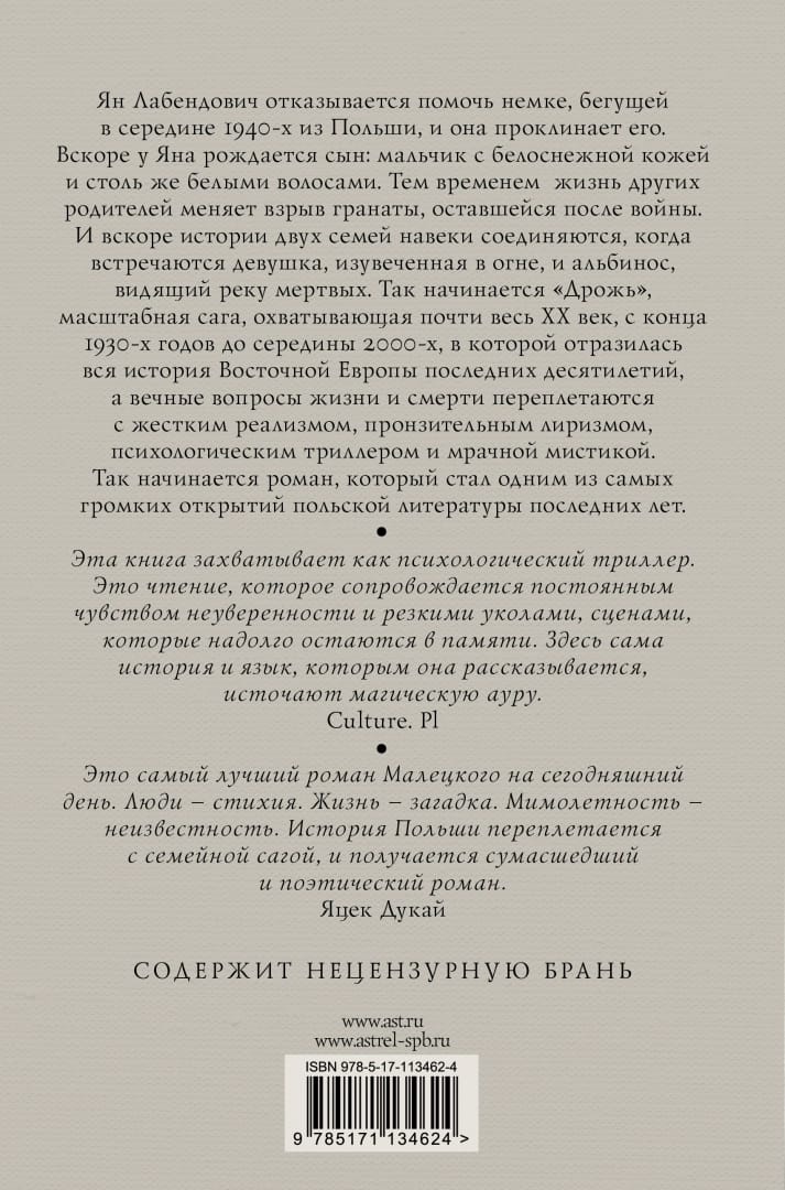 Ян Лабендович отказывается помочь немке, бегущей в середине 1940‑х из Польши, и она проклинает его. Вскоре у Яна рождается сын: мальчик с белоснежной кожей и столь же белыми волосами. Тем временем жизнь других родителей меняет взрыв гранаты, оставшейся после войны. И вскоре истории двух семей навеки соединяются, когда встречаются девушка, изувеченная в огне, и альбинос, видящий реку мертвых. Так начинается «Дрожь», масштабная сага, охватывающая почти весь XX век, с конца 1930‑х годов до середины 2000‑х, в которой отразилась вся история Восточной Европы последних десятилетий, а вечные вопросы жизни и смерти пере плетаются с жестким реализмом, пронзительным лиризмом, психологическим триллером и мрачной мистикой. Так начинается роман, который стал одним из самых громких открытий польской литературы последних лет.