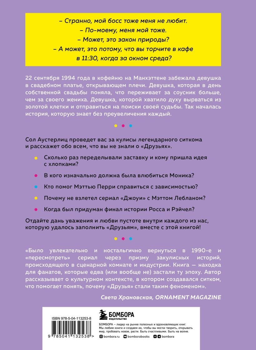 22 сентября 1994 года в кофейню на Манхэттене забежала девушка в свадебном платье, открывающем плечи. Девушка, которая в день собственной свадьбы поняла, что переживает за соусник больше, чем за своего жениха. Девушка, которой хватило духу вырваться из золотой клетки и отправиться на поиски своей судьбы. Так началась история, которую знает без преувеличения каждый. Сериал «Друзья» полюбился зрителем тем, что рассказывал о молодости, одиночестве и беззаботной жизни. Он затронул самые важные вехи в жизни молодых людей: первую работу, первые серьезные отношения, брак и воспитание детей. Он показал зрителям, как выглядит и чувствуется взрослая жизнь — или, по крайней мере, как она может выглядеть и чувствоваться. «Друзья» обещали, что какие бы испытания ни принесло взросление — душевные муки, одиночество или неудачи на работе, — все трудности могут быть пережиты в компании близких друзей. Мир вокруг постоянно меняется, но дружба вечна. И вот уже 26 лет шестеро друзей из Нью-Йорка дарят зрителям по всему уверенность во времена потрясений и нестабильности. Из этой книги вы узнаете, как «Друзья» дошли до экранов и почему никто не сможет создать что-то похожее. Автор проведет вас за кулисы создания культового сериала, проанализирует основные сюжетные линии и расскажет, как снимался каждый сезон, как писались шутки и насколько финал сериала далек от первоначальной задумки. Какие-то факты вы уже знали, какие-то вам только предстоит узнать, но это путешествие в ностальгический мир «Друзей» однозначно стоит того!