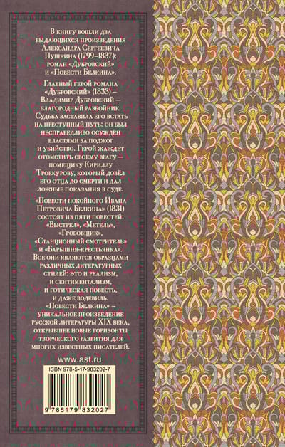 В книгу вошли два выдающихся произведения Александра Сергеевича Пушкина (1799–1837): роман «Дубровский» и «Повести Белкина».