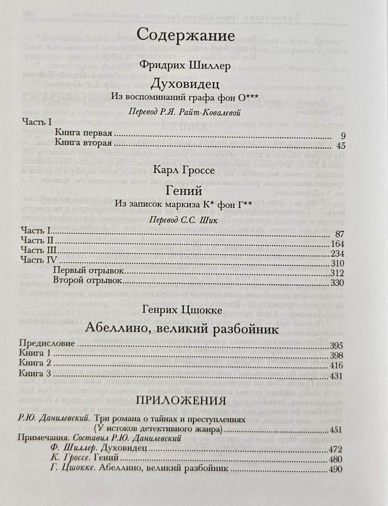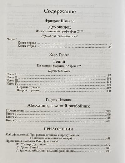 Все три истории по-разному трактуют схожие темы и предлагают читателю не только насладиться тонкой разработкой характеров (Шиллер), литературной игрой с традиционными жанрами (пастораль, плутовской роман, готический роман и другое — Гроссе), но и погрузиться в мир страстей, героев-«суперменов» (Цшокке), намечая рождение новых жанров — детектива и триллера.