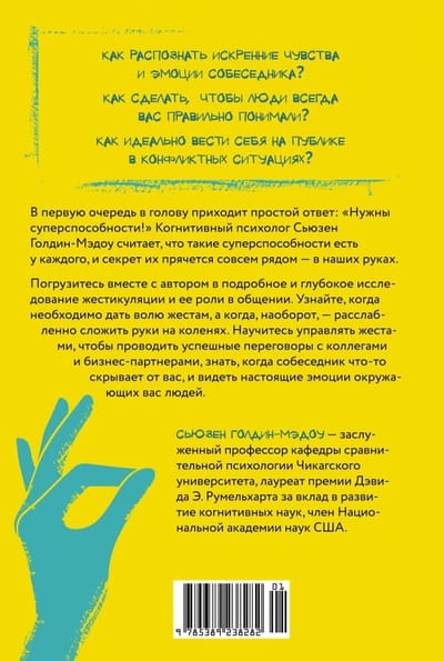 Как распознать искренние чувства и эмоции собеседника? Как сделать, чтобы люди всегда вас правильно понимали? Как идеально вести себя на публике в конфликтных ситуациях? В первую очередь в голову приходит простой ответ: «Нужны суперспособности!» Когнитивный психолог Сьюзен Голдин-Мэдоу считает, что такие суперспособности есть у каждого и секрет их прячется совсем рядом — в наших руках. Погрузитесь вместе с автором в подробное и глубокое исследование жестикуляции и ее роли в общении. Узнайте, когда необходимо дать волю жестам, а когда, наоборот, — расслабленно сложить руки на коленях. Научитесь управлять жестами, чтобы проводить успешные переговоры с коллегами и бизнес-партнерами, знать, когда собеседник что-то скрывает от вас, и видеть настоящие эмоции окружающих вас людей.