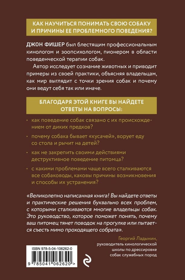 Двадцать лет назад автор этой книги Джон Фишер совершил революцию в воспитании собак сначала в Англии, а затем в США. В этой книге о психологии домашних питомцев автор исследует сознание собак и приводит примеры из своего практического опыта, объясняя владельцам, как мир выглядит с точки зрения собак. В первом разделе книги повествуется о характерном поведении собак, которое связано с их происхождением от волков или шакалов. Во второй части исследуется то, с чем сталкивается большинство хозяев, проблемное поведение их питомцев, которое на самом деле представляет собой обычное собачье поведение, демонстрируемое не в том месте. В конце книги вы найдете список общих проблем от А до Я, причины возникновения и способы их устранения.