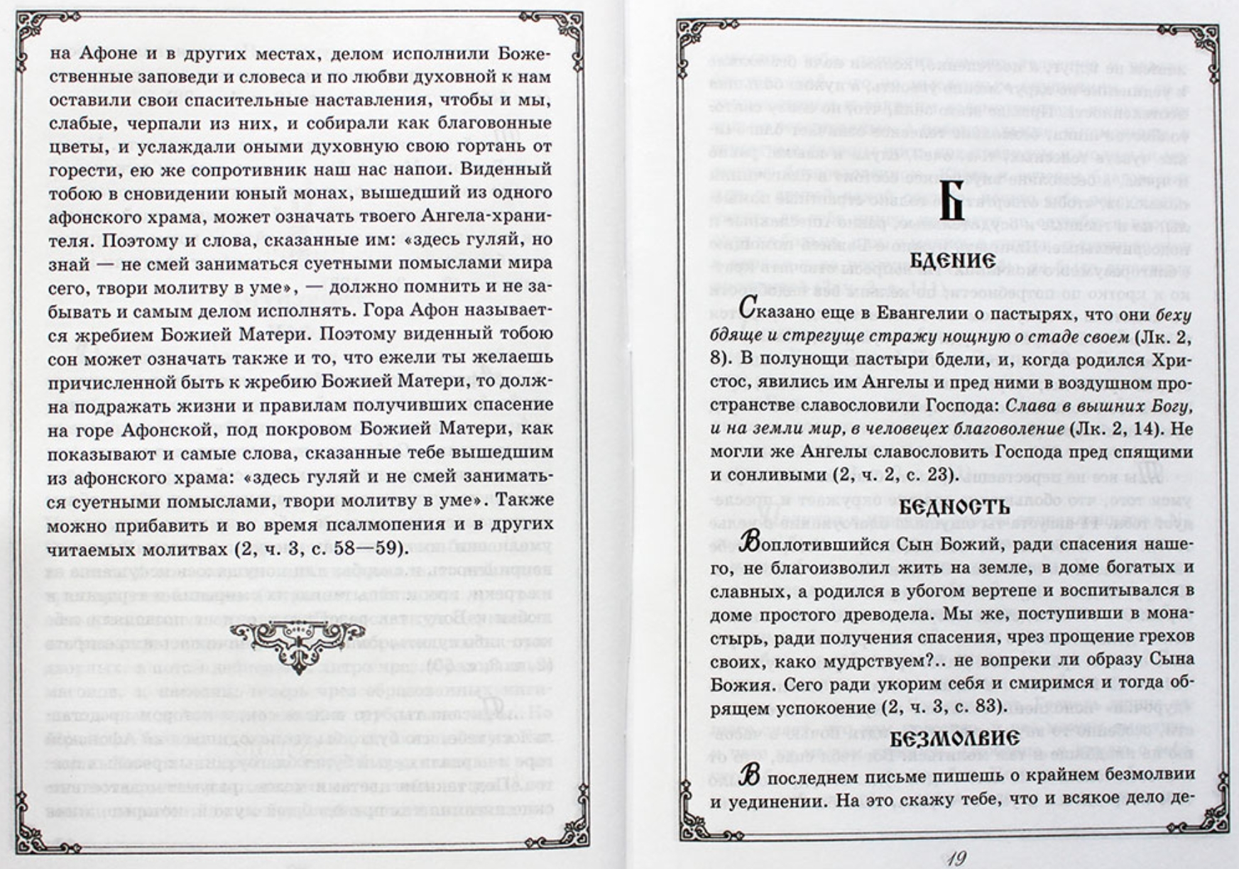 Книга поучений преподобного Амвросия Оптинского представляет собой практическое духовное руководство на основе писем и статей старца, систематизированное по разделам духовной жизни в алфавитном порядке. Составлено на основе дореволюционных изданий «Собрания писем» в 3-х частях, жизнеописаний старца Амвросия, многочисленных публикаций (в том числе в журнале «Душеполезное чтение»), изданных в период с 1892 по 1912 годы. Каждое поучение содержит ссылку на источник. Книга предваряется кратким житием прп. Амвросия. Имеется список литературы, алфавитный указатель тем.