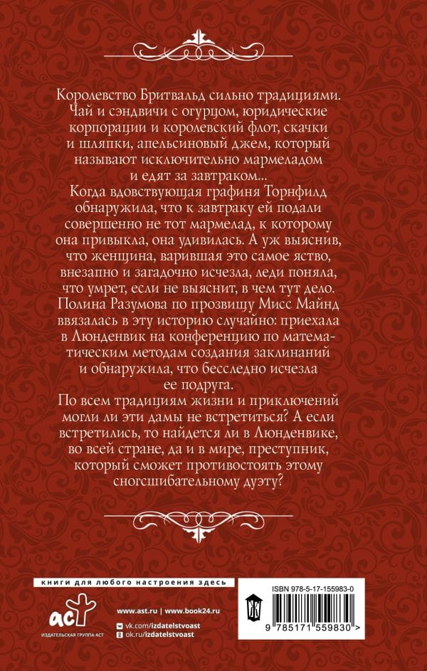 Королевство Бритвальд сильно традициями. Чай и сэндвичи с огурцом, юридические корпорации и королевский флот, скачки и шляпки, апельсиновый джем, который называют исключительно мармеладом и едят за завтраком… Когда вдовствующая графиня Торнфилд обнаружила, что к завтраку ей подали совершенно не тот мармелад, к которому она привыкла, она удивилась. А уж выяснив, что женщина, варившая это самое яство, внезапно и загадочно исчезла, леди поняла, что умрет, если не выяснит, в чем тут дело. Полина Разумова по прозвищу Мисс Майнд ввязалась в эту историю случайно: приехала в Люнденвик на конференцию по математическим методам создания заклинаний и обнаружила, что бесследно исчезла ее подруга. По всем традициям жизни и приключений могли ли эти дамы не встретиться? А если встретились, то найдется ли в Люнденвике, во всей стране, да и в мире, преступник, который сможет противостоять этому сногсшибательному дуэту?