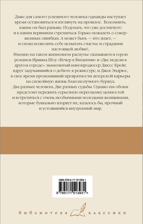 Даже для самого успешного человека однажды наступает время остановиться и взглянуть на прошлое. Вспомнить, каким он был раньше. Подумать, что уже достигнуто и к каким вершинам стремиться. Горько пожалеть о совершенных ошибках. А может быть, — кто знает, — и снова позволить себе испытать счастье и страдания настоящей любви?.. Именно на таком жизненном распутье оказываются герои романов Ирвина Шоу «Вечер в Византии» и «Две недели в другом городе»: знаменитый кинопродюсер Джесс Крейг, вдруг задумавшийся о дебюте в режиссуре, и Джек Эндрюс, в свое время променявший превратности актерской карьеры на спокойную жизнь благополучного буржуа. Два разных человека. Две разных судьбы. Однако им обоим предстоит пережить серьезную переоценку ценностей и встретиться с очень необычными молодыми женщинами, которые буквально взорвут их, казалось бы, прочный и устоявшийся внутренний мир.
