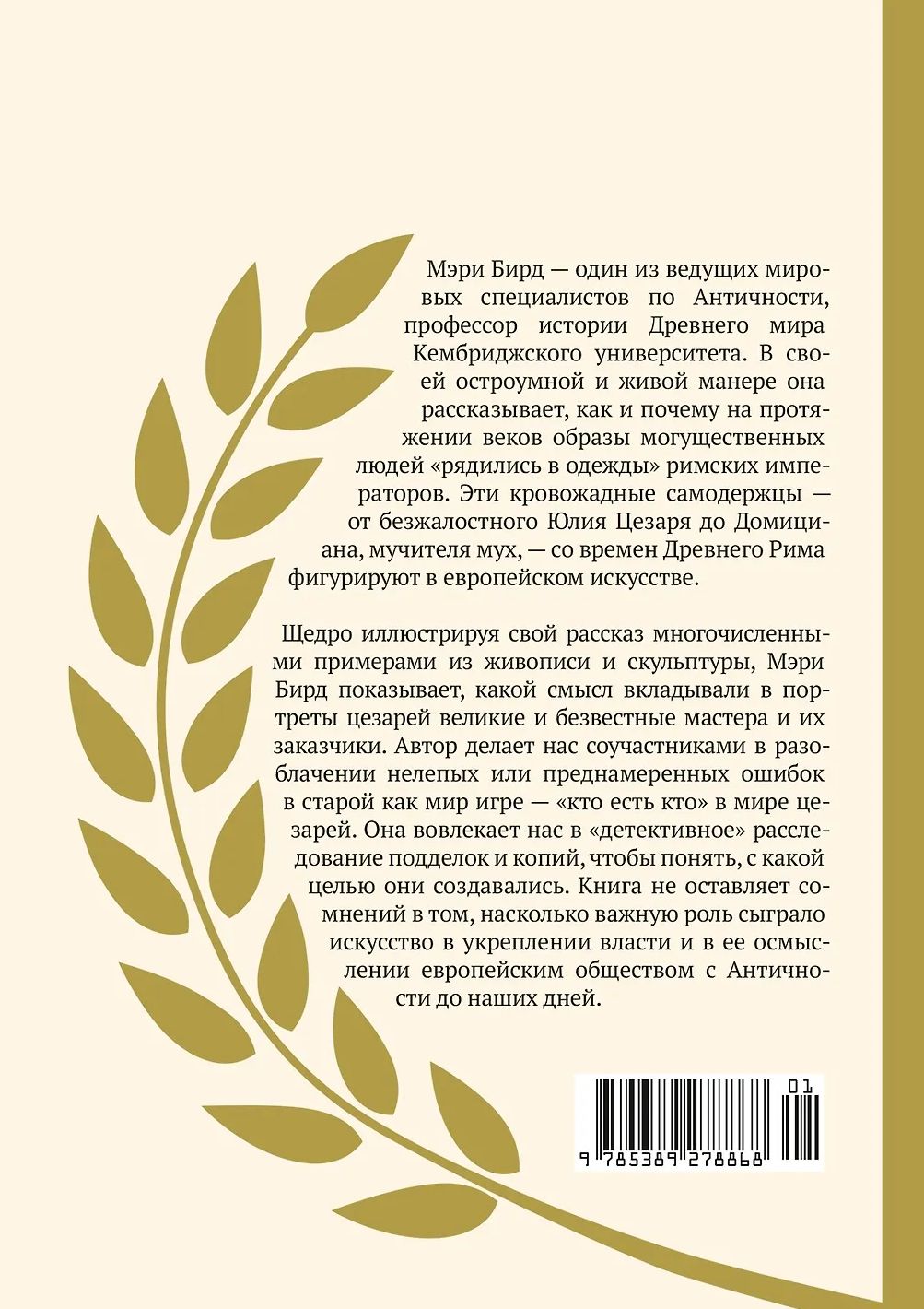 Историк Мэри Бирд, автор бестселлера «SPQR: История Древнего Рима», на этот раз погружает нас в захватывающий рассказ о том, как на протяжении 2000 лет образы римских императоров влияли на европейское искусство и даже политику. Великолепно иллюстрированная книга предлагает путешествие по европейской истории искусства от Античности до наших дней. Мэри Бирд исследует, как сформировался изобразительный «канон» двенадцати цезарей, а затем прослеживает, как его переосмысливали, видоизменяли, а также, вольно или невольно, делали ошибки, путали императоров, их жен и матерей. Автор раскрывает все звенья своего «детективного» расследования, разрешившего целый ряд загадок и ошибок в истории искусства. Мэри Бирд реконструирует исчезнувшие навсегда прославленные серии картин и гобеленов и раскрывает подлинную личность целого ряда произведений.