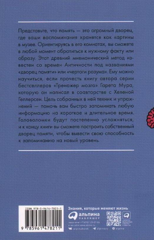 Представьте, что память — это огромный дворец, где ваши воспоминания хранятся как картины в музее. Ориентируясь в его комнатах, вы сможете в любой момент обратиться к нужному факту или образу. Этот древний мнемонический метод известен со времен Античности под названиями «дворец памяти» или «чертоги разума». Ему можно научиться, если прочесть книгу автора серии бестселлеров «Тренажер мозга» Гарета Мура, которую он написал в соавторстве с Хеленой Геллерсен.