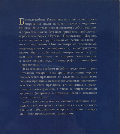 В учебном пособии представлено сравнительное диахронно-синхронное описание корпуса двунадесятых праздников по следующим признакам: событие праздника, история его установления, святоотеческая экзегеза праздника, его динамика в богослужении.