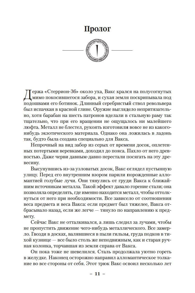 Три романа из цикла о Ваксе и Уэйне в одной книге! Когда-то мир был погружен во тьму и завален пеплом, но наступила новая эпоха — эпоха пара и электричества, поездов и небоскребов. Двадцать лет назад Ваксиллиум Ладриан, наследник благородного Дома, покинул великий город Элендель, чтобы охранять закон и порядок в далеком Дикоземье. Понеся тяжелую утрату, он решает вернуться и начать жизнь заново. Но его ожидает цепь событий, которая заставит вспомнить о ремесле законника и достать из сундука револьверы. В городе орудует банда неимоверно хитрых и умных преступников, и никто не может с ними справиться? Кто-то сеет смуту, пытаясь ввергнуть Элендель в хаос? Зловещее тайное общество строит планы, способные непоправимым образом изменить судьбу всего человечества? Ваксиллиум Ладриан и его друзья бесстрашно возьмутся за разгадку очередной тайны, пусть даже придется иметь дело с могущественными врагами, собственным прошлым, мифическими существами и легендарными артефактами.