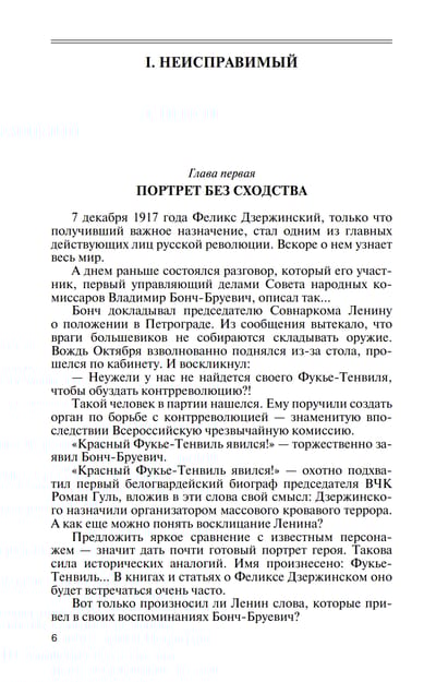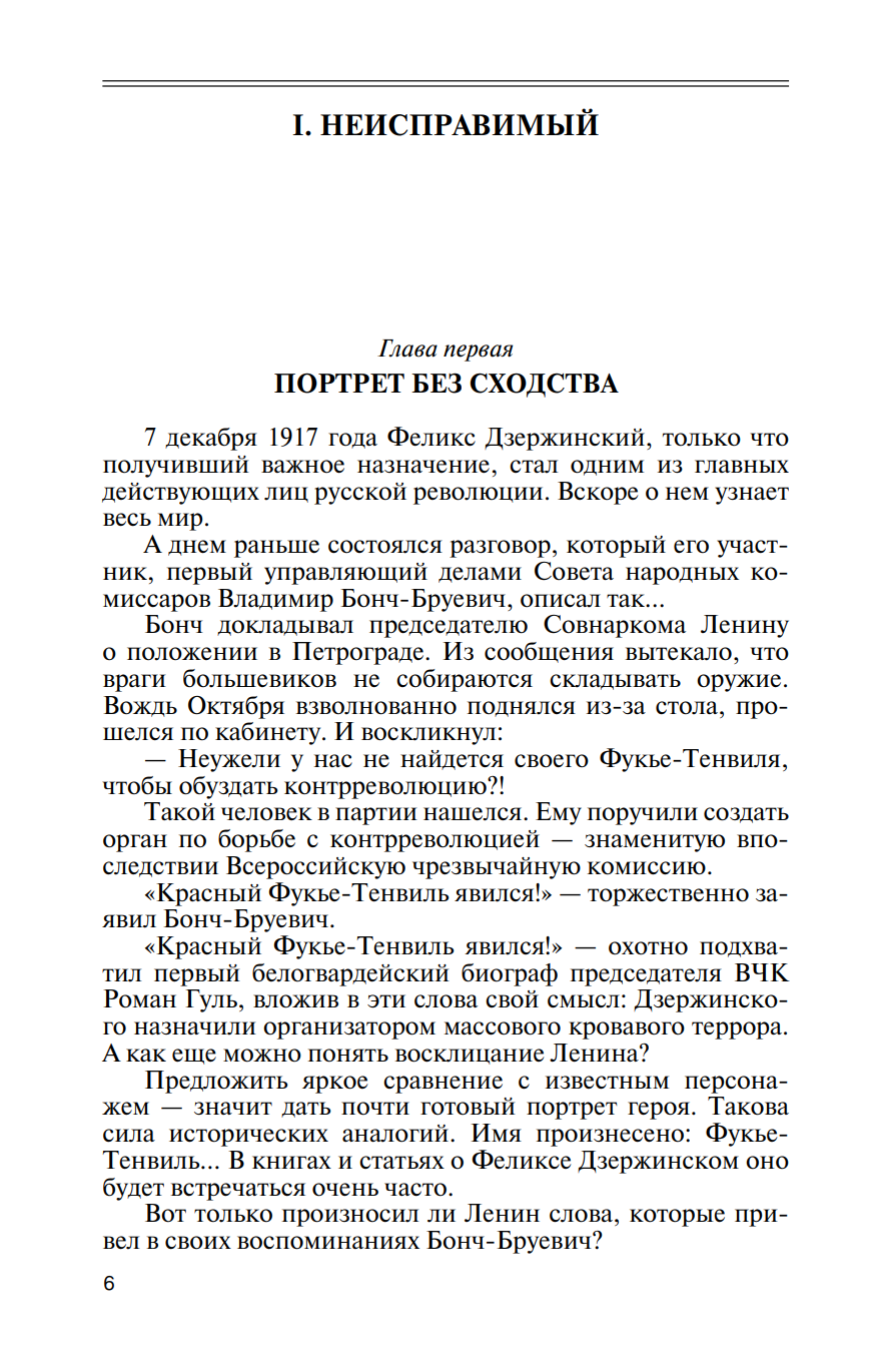 Эту книгу можно назвать «‎портретом на фоне эпохи»‎, причем портретом весьма объективным, что, несомненно, вызовет интерес современного читателя, который получит возможность познакомиться с малоизвестными страницами истории нашей страны, узнать для себя немало нового и даже неожиданного. Автор не стремится ни демонизировать, ни в чем-то обелять своего героя - «‎пламенного революционера»‎ и председателя ВЧК. Ведь события конца XIX - начала XX веков в России имели свою неумолимую, страшную логику, а имя Феликса Дзержинского связано с ними неразрывно.