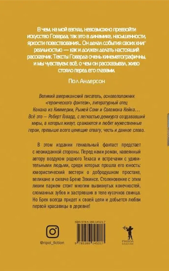 Идея этого уморительного вестерна была навеяна Роберту Говарду атмосферой родного Техаса и встречами с замечательными людьми: великий писатель еще застал настоящих ковбоев начала XX столетия! Верзила Брек Элкинс — самый сильный парень на селе, но вместе с тем добродушный простак: да его ребенок вокруг пальца обведет! Однако Брек всегда придет к своей цели — поможет слабым, покарает злодеев, принесет в родные края свет просвещения и добьется любви первой красавицы в округе! Другой вопрос — в какую он на сей раз попадет передрягу и сколько при этом пострадает человек... Роман, не издававшийся в России более четверти века, представлен в новом переводе. Произведение украшают иллюстрации, специально подготовленные для настоящего издания.