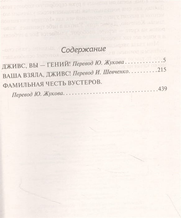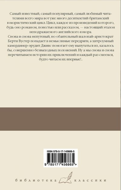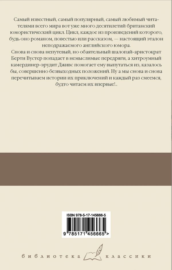 Самый известный, самый популярный, самый любимый читателями всего мира вот уже много десятилетий британский юмористический цикл. Цикл, каждое из произведений которого, будь оно романом, повестью или рассказом, — настоящий эталон неподражаемого английского юмора. Снова и снова непутевый, но обаятельный шалопай-аристократ Берти Вустер попадает в немыслимые передряги, а хитроумный камердинер-эрудит Дживс помогает ему выпутаться из, казалось бы, совершенно безвыходный положений. Ну а мы снова и снова перечитываем истории их приключений и каждый раз смеемся, будто читаем их впервые!..