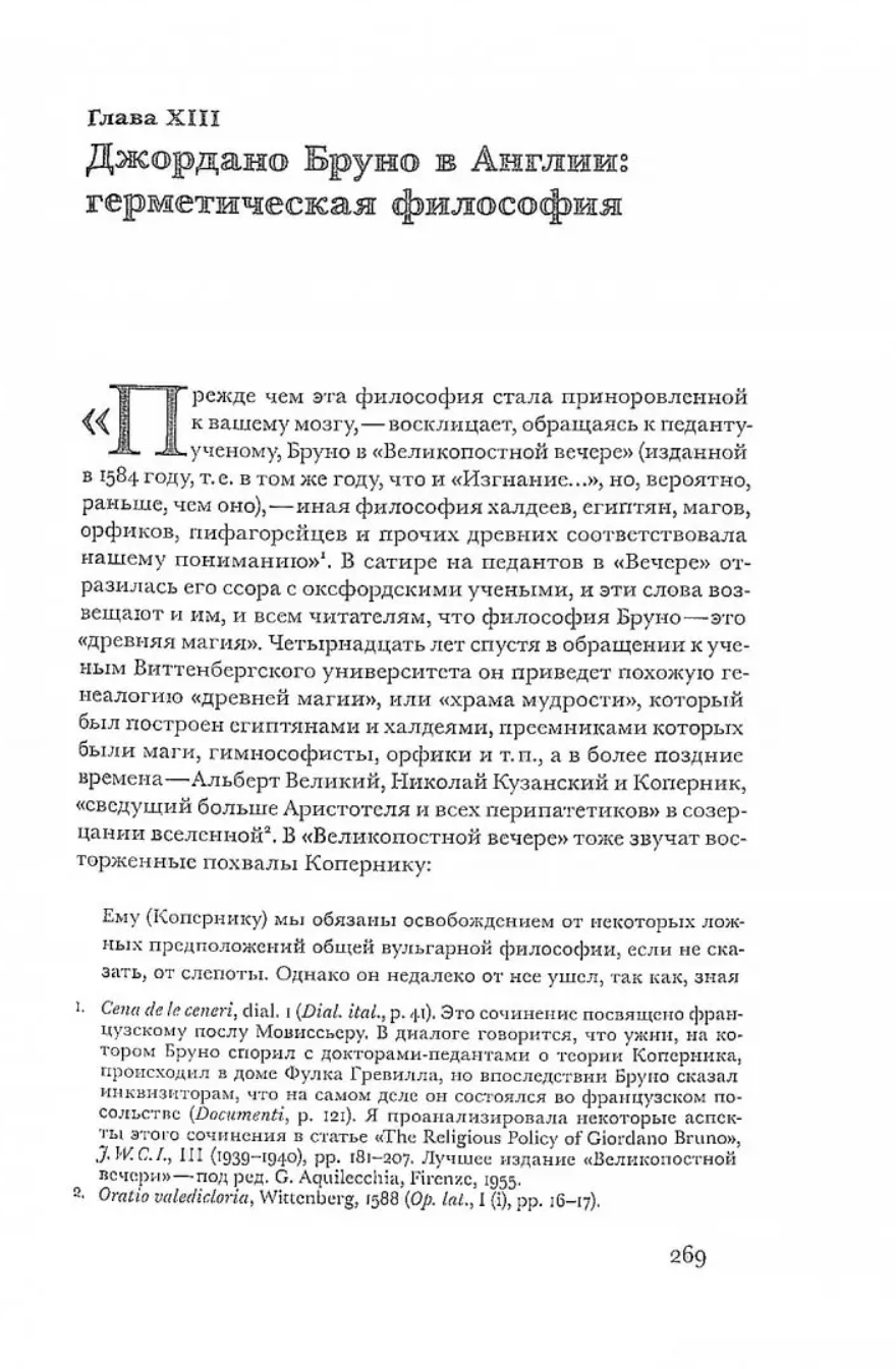 Английская исследовательница ренессансной культуры Фрэнсис А. Йейтс (1899–1981) — представитель блестящего научного сообщества, известного как «Институт Варбурга». Книга «Джордано Бруно…» (1964) — первая из целой серии знаменитых работ Йейтс, позволивших совершенно по-новому понять логику развития европейской культуры в начале Нового времени.