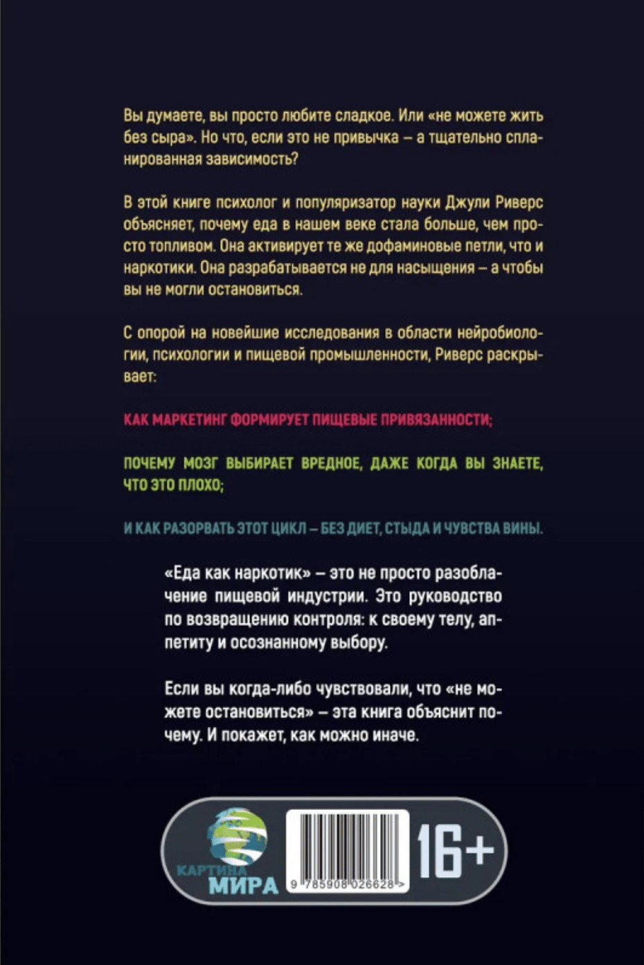 В этой книге психолог и популяризатор науки Джули Риверс объясняет, почему еда в нашем веке стала больше, чем просто топливом. Она активирует те же дофаминовые петли, что и наркотики. Она разрабатывается не для насыщения а чтобы вы не могли остановиться. С опорой на новейшие исследования в области нейробиологии, психологии и пищевой промышленности, Риверс раскрывает: