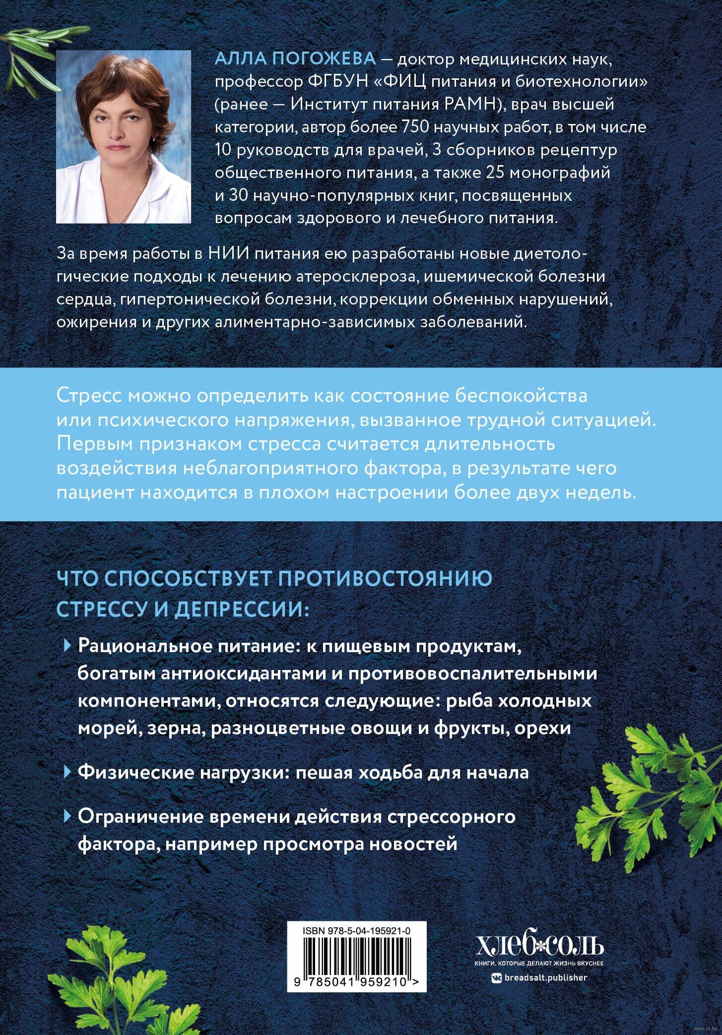 Стресс — это то, с чем сталкивается каждый современный человек. Сначала он пытается не замечать его, потом обращается к врачу, потом поедает килограммы таблеток, которые помогают лишь на короткое время. И лишь осознав, что от стресса не убежишь, начинает менять свое мнение о нем. Эта книга поможет не только понять, отчего возникает стресс, его причины и неприятные последствия, но и укажет самый жизненный способ борьбы с ним, преодоления его и выработки устойчивости по отношению к нему. И этот способ — знание, как питаться, чтобы не накапливать в себе негатив; какие продукты облегчают его действие, какие предотвращают. Алла Погожева, доктор медицинских наук, профессор Института питания, проработавшая в нем более 30 лет, предлагает без всяких диет поправлять свое душевное здоровье с помощью баланса в питании, подвижности в повседневной жизни и ограничения негативных новостных факторов. Более 100 рецептов дают практическую возможность испробовать этот простой способ борьбы с неблагоприятными ситуациями у себя дома.