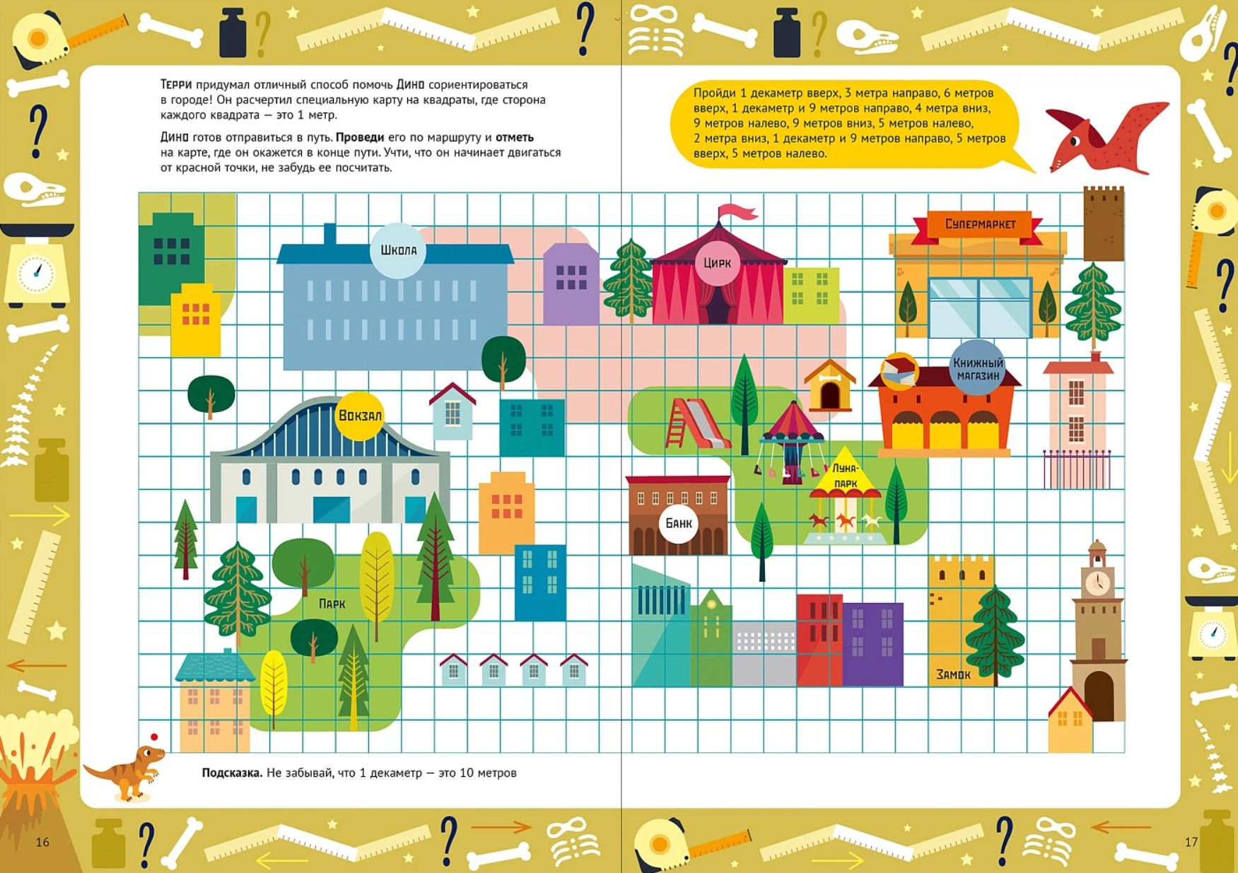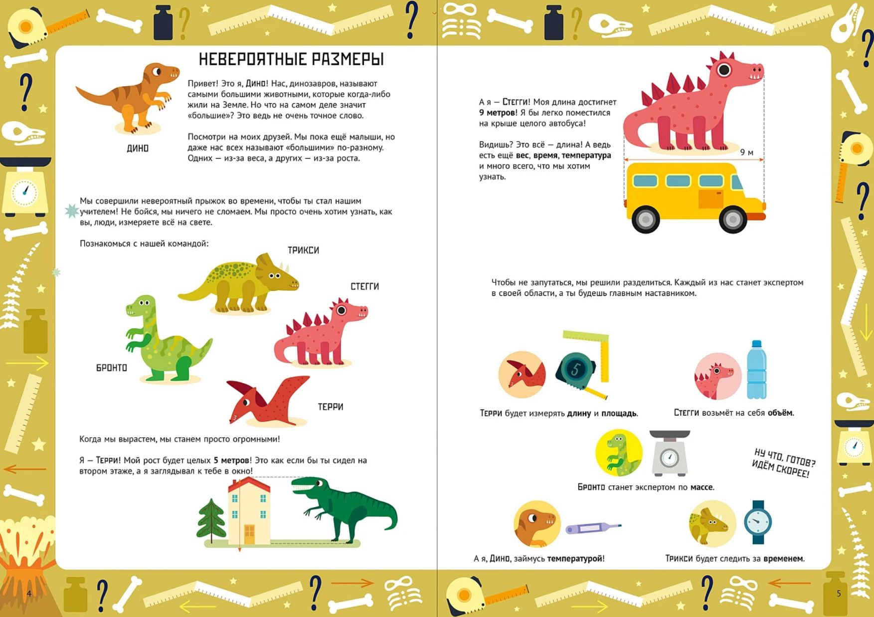 Тетрадь построена как квест, где ребёнок становится главным наставником для команды динозавров, которые совершили прыжок во времени, чтобы узнать, как люди измеряют мир. Каждая тема — новое задание от дино-помощников: нужно собрать линейку, провести Дино по городу с помощью карты, сразиться в «Морской бой» для измерения площади и даже поучаствовать в Дино-олимпиаде.