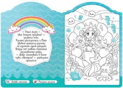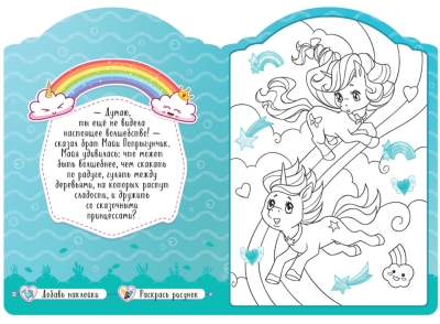 В книге вас ждет увлекательная сказочная история о приключениях очаровательных единорогов Майи и Попрыгунчика и 8 больших картинок, которые нужно раскрасить, а затем украсить наклейками. В конце книги художника ждет сюрприз – красочный диплом от Майи и ее друзей.
