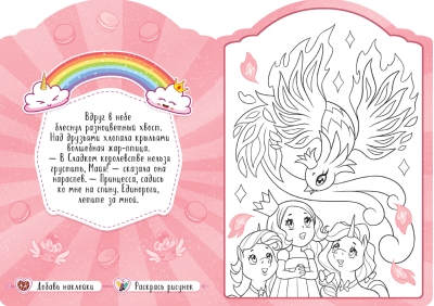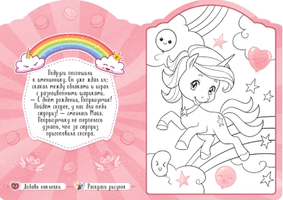 В книге вас ждет увлекательная сказочная история о приключениях очаровательных единорогов Майи и Попрыгунчика и 8 больших картинок, которые нужно раскрасить, а затем украсить наклейками. В конце книги художника ждет сюрприз – красочный диплом от Майи и ее друзей.