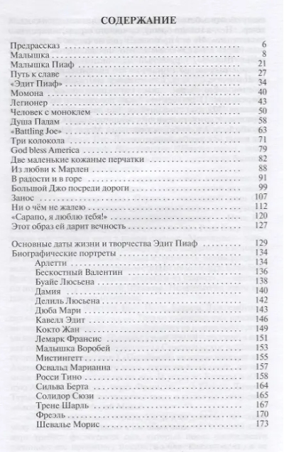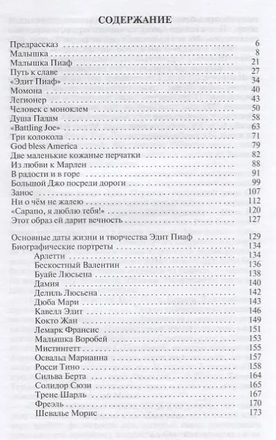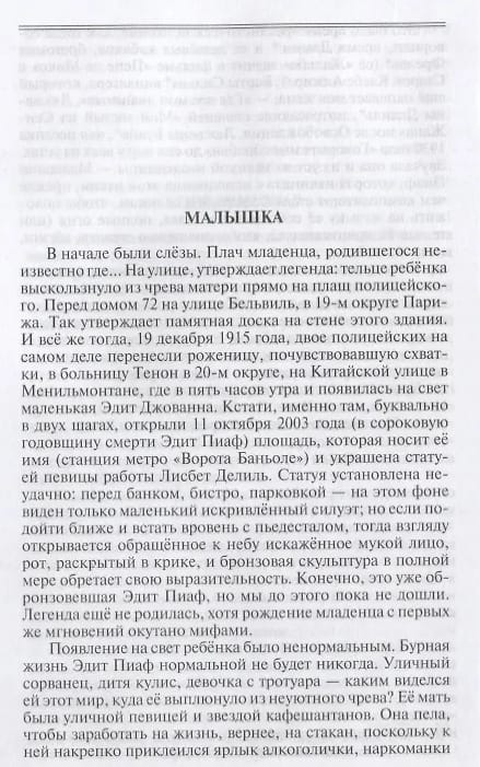 Эдит Пиаф (Эдит Джованна Гассион, 1915—1963) — не просто эстрадная певица. Прозванная в юности «Малышкой Пиаф», она стала воплощением самой французской песни. «Жизнь в розовом свете», «Гимн любви», «Толпа» — эти песни и сегодня исполняют во всём мире. Не ограничиваясь легендами (бедное детство в Бельвиле, паломничество к святой Терезе, вернувшей девочке утраченное зрение, зависимость от морфия, многочисленные любовные романы — с Марселем Серданом, Ивом Монтаном, Жоржем Мустаки и другими), автор показывает нам женщину, ставшую частью своей эпохи, мужественную и нежную, идущую на риск и превозмогающую боль, о которой Жан Кокто говорил, что никогда ещё не встречал человека, менее скупого на свою душу, «которая не тратила её, а транжирила, бросая это золото на ветер».