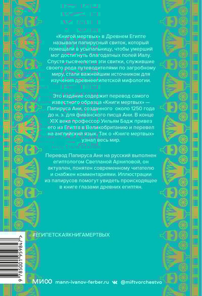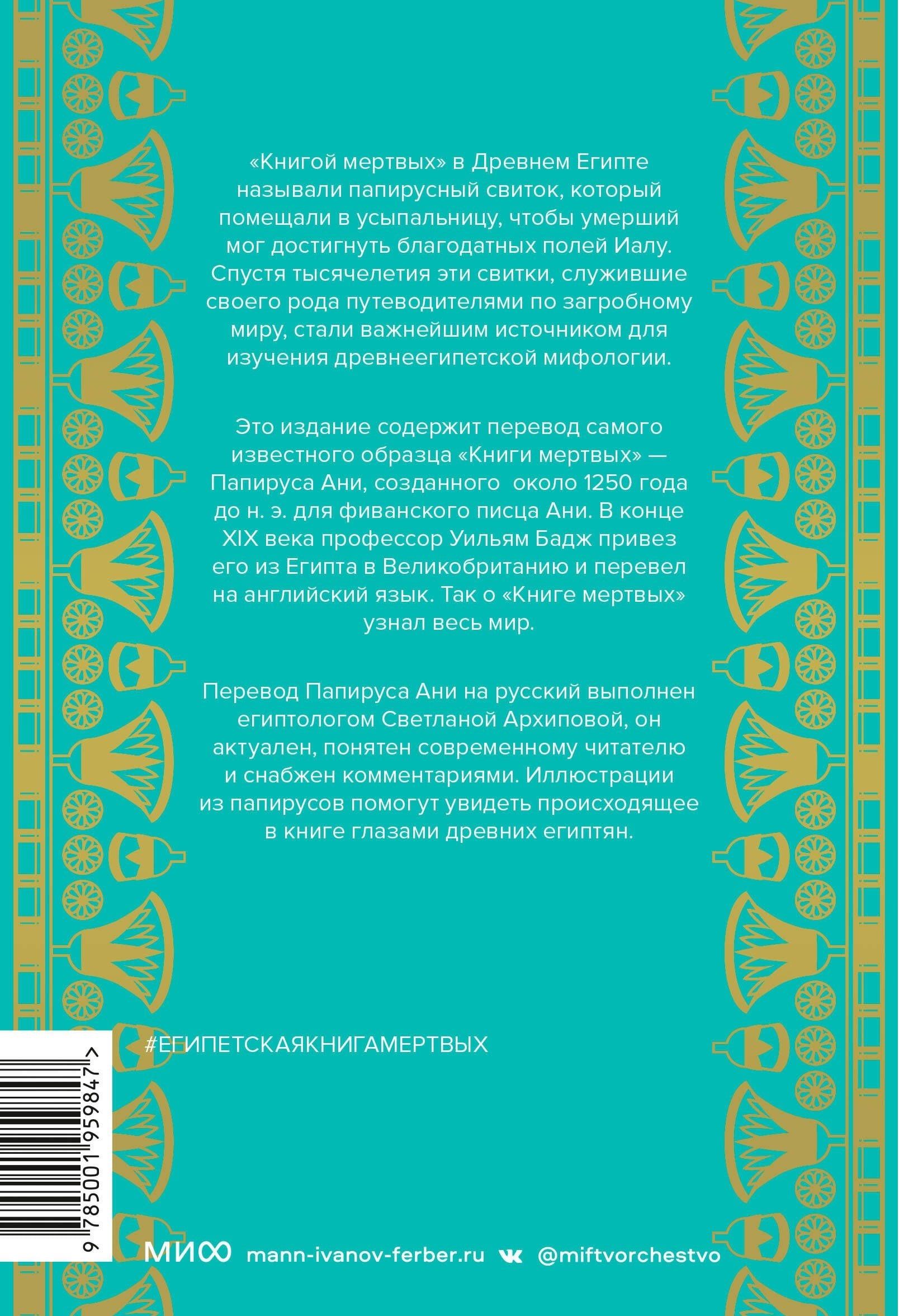Книгой мертвых в Древнем Египте называли свиток с религиозными текстами, который помещали в гробницу, чтобы умерший мог достигнуть благодатных полей Иалу. Эта книга содержит перевод самого известного образца Книги мертвых — легендарного Папируса Ани.