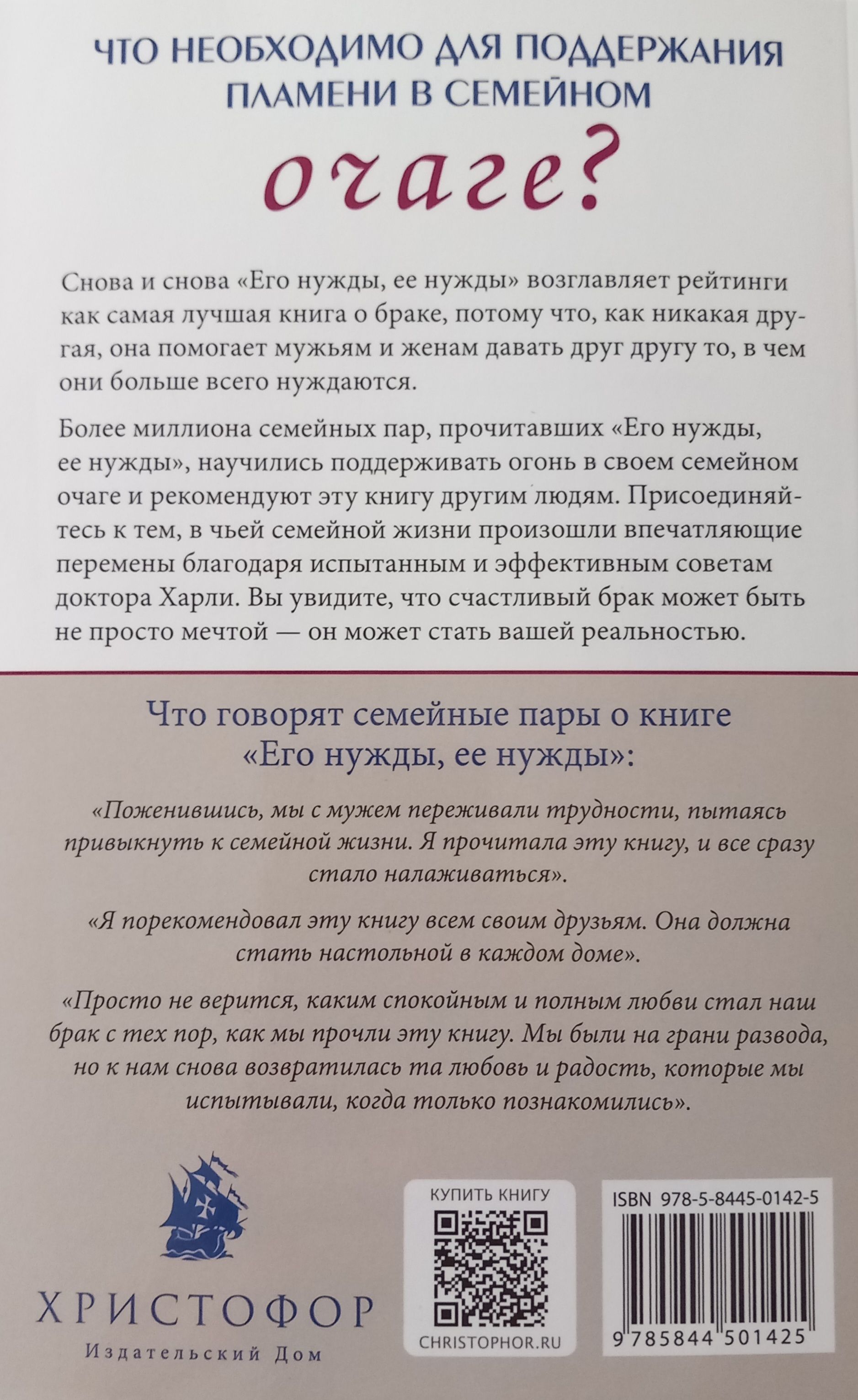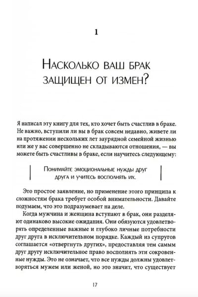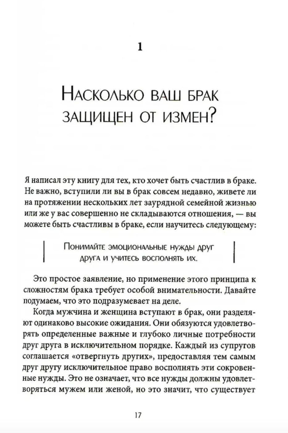 Счастливый брак требует умения и заботы. Но мужчины склонны пытаться удовлетворить те нужды женщин, которые на их взгляд важнее, женщины делают то же самое. Проблема в том, что нужды мужчин и женщин зачастую сильно отличаются, и мы напрасно тратим силы, пытаясь восполнить не то, что нужно. Эта книга поможет вам выявить самые важные эмоциональные потребности, уникальные для вас и вашего супруга и научиться восполнять их. Вы сможете защитить свой брак от измен, создав отношения, где сохраняется романтика, а супруги с каждым годом становятся ближе друг к другу. Предложите вашей второй половине читать книгу вместе с вами, заполнять анкеты и отвечать на вопросы в конце каждой главы. Вы даже можете выделять текст по мере прочтения двумя разными маркерами, чтобы показать друг другу, что для вас важнее всего.