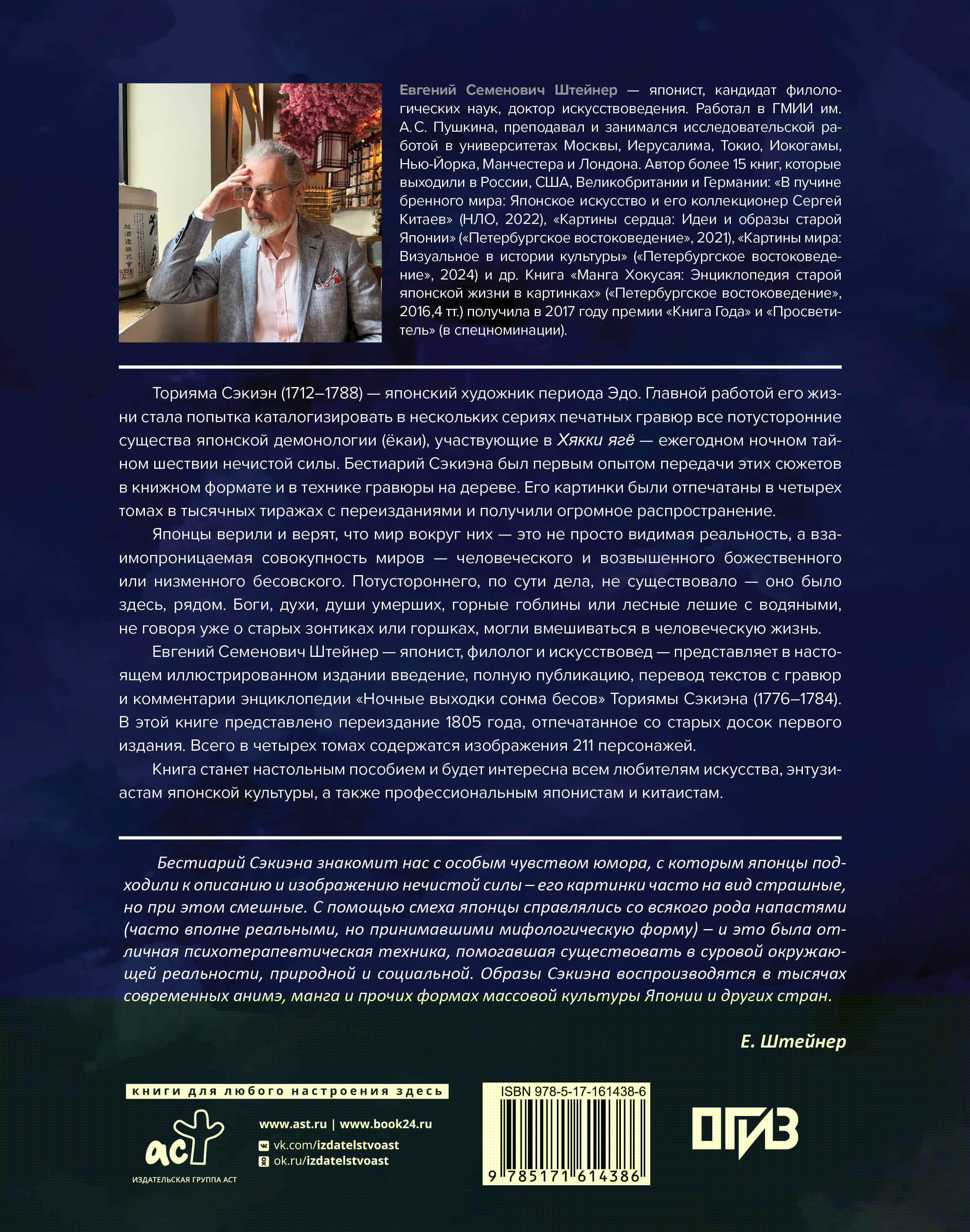 Евгений Семенович Штейнер – японист, филолог и искусствовед – представляет в настоящем иллюстрированном издании введение, полную публикацию, перевод текстов с гравюр и комментарии энциклопедии «Ночные выходки сонма бесов» Ториямы Сэкиэна (1776–1784). В этой книге представлено переиздание 1805 года, отпечатанное со старых досок первого издания. Всего в четырех томах содержатся изображения 211 персонажей.