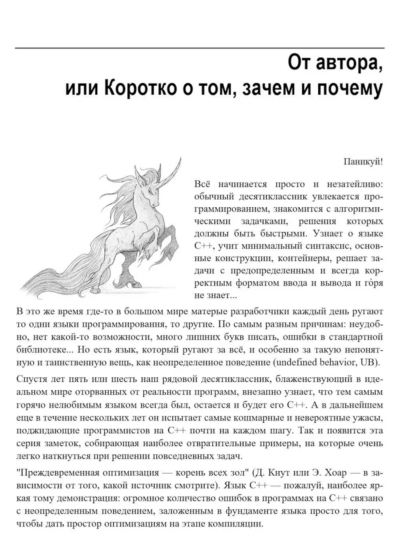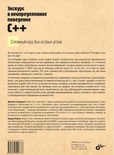 Книга представляет собой обширный справочник типичных, а также очень редко встречающихся ошибок, характерных для программ на C++, Rust и других языках для низкоуровневого и системного программирования, в частности на ассемблере. Все рассмотренные проблемы так или иначе связаны с неопределенным, неуточненным и определяемым реализацией поведением языковых конструкций. Наибольшее внимание уделено неопределенному поведению, возможным признакам его присутствия в программах и методам поиска, диагностики и устранения такого поведения.