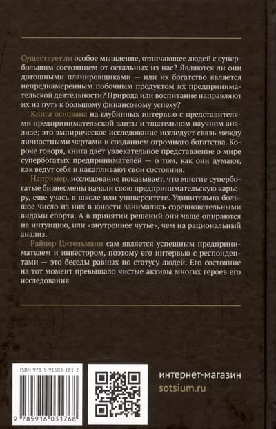 Книга основана на глубинных интервью с представителями предпринимательской элиты и тщательном научном анализе; это эмпирическое исследование исследует связь между личностными чертами и созданием огромного богатства. Короче говоря, книга дает увлекательное представление о мире супербогатых предпринимателей — о том, как они думают, как ведут себя и накапливают свои состояния.