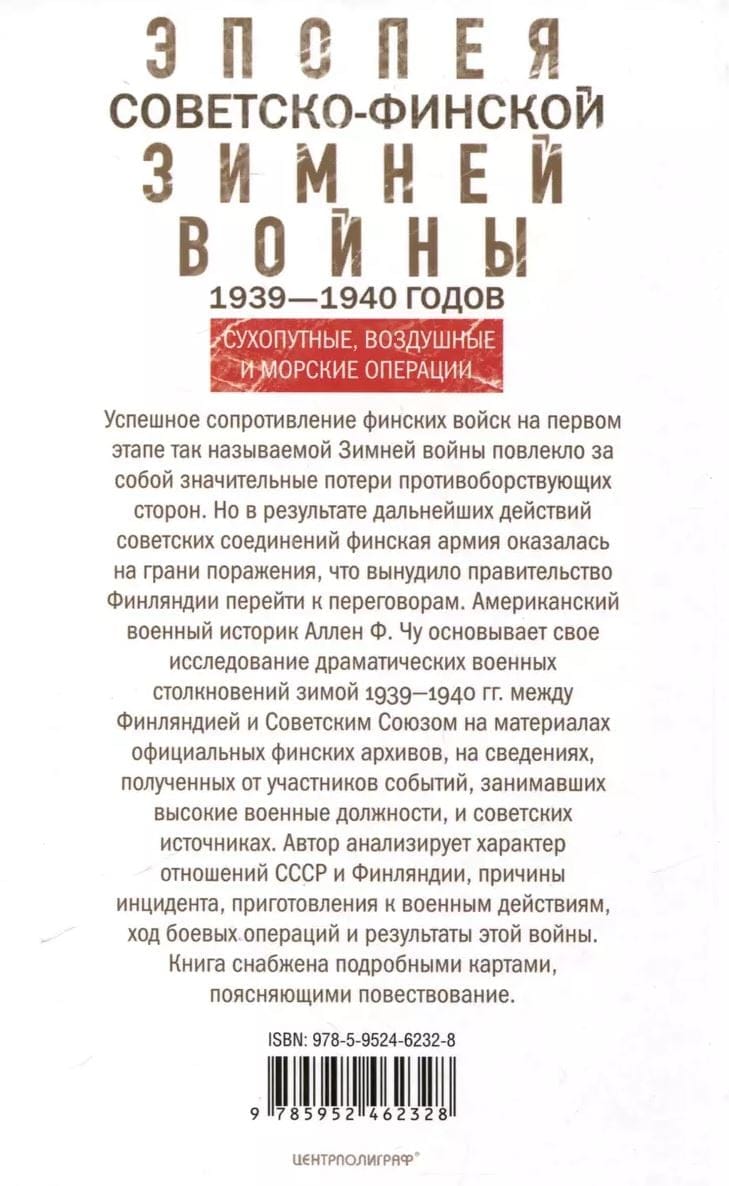 Успешное сопротивление финских войск на первом этапе так называемой Зимней войны повлекло за собой значительные потери противоборствующих сторон. Но в результате дальнейших действий советских соединений финская армия оказалась на грани поражения, что вынудило правительство Финляндии перейти к переговорам. Американский военный историк Аллен Ф. Чу основывает свое исследование драматических военных столкновений зимой 1939—1940 гг. между Финляндией и Советским Союзом на материалах официальных финских архивов, на сведениях, полученных от участников событий, занимавших высокие военные должности, и советских источниках. Автор анализирует характер отношений СССР и Финляндии, причины инцидента, приготовления к военным действиям, ход боевых операций и результаты этой войны. Книга снабжена подробными картами, поясняющими повествование.