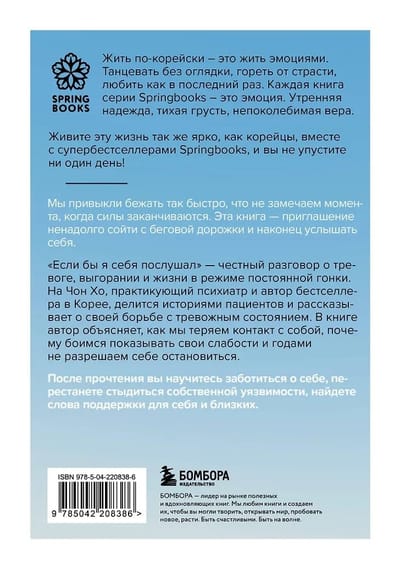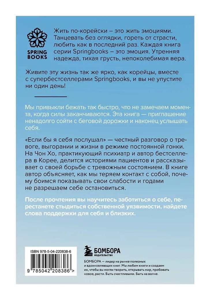 «Если бы я себя послушал» — честный разговор о тревоге, выгорании и жизни в режиме постоянной гонки. На Чон Хо, практикующий психиатр и автор бестселлера в Корее, делится историями пациентов и рассказывает о своей борьбе с тревожным состоянием. В книге автор объясняет, как мы теряем контакт с собой, почему боимся показывать свои слабости и годами не разрешаем себе остановиться.