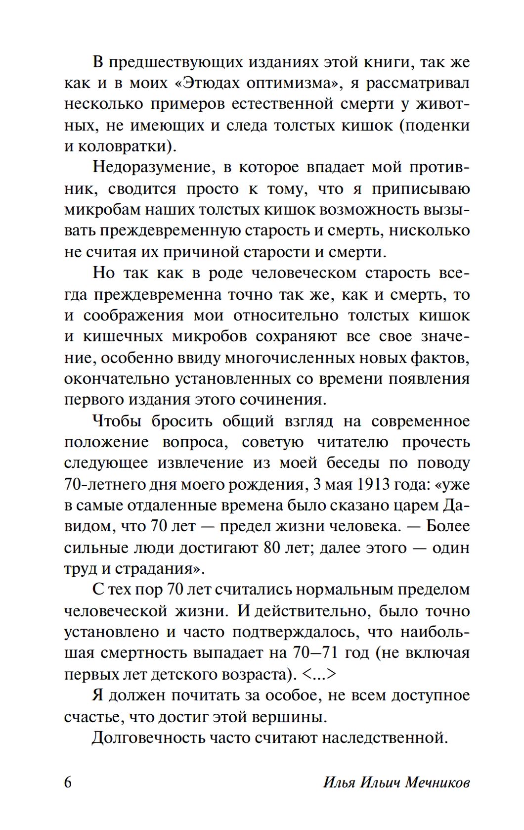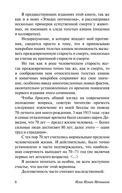 Вопросы старости и смерти всегда занимали важное место в исследованиях Мечникова. В своем труде «Этюды о природе человека» известный биолог в простой и изящной форме рассказывает о жизни и смерти живых существ, о строении тела человека и возможных причинах старения, о достоинствах, недостатках и «дисгармониях« человеческого организма, и о возможностях, которые изначально в нем заложены и должны помогать бороться со старостью, словно с любой другой болезнью.