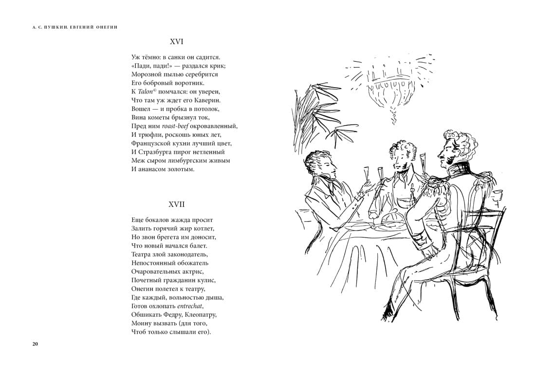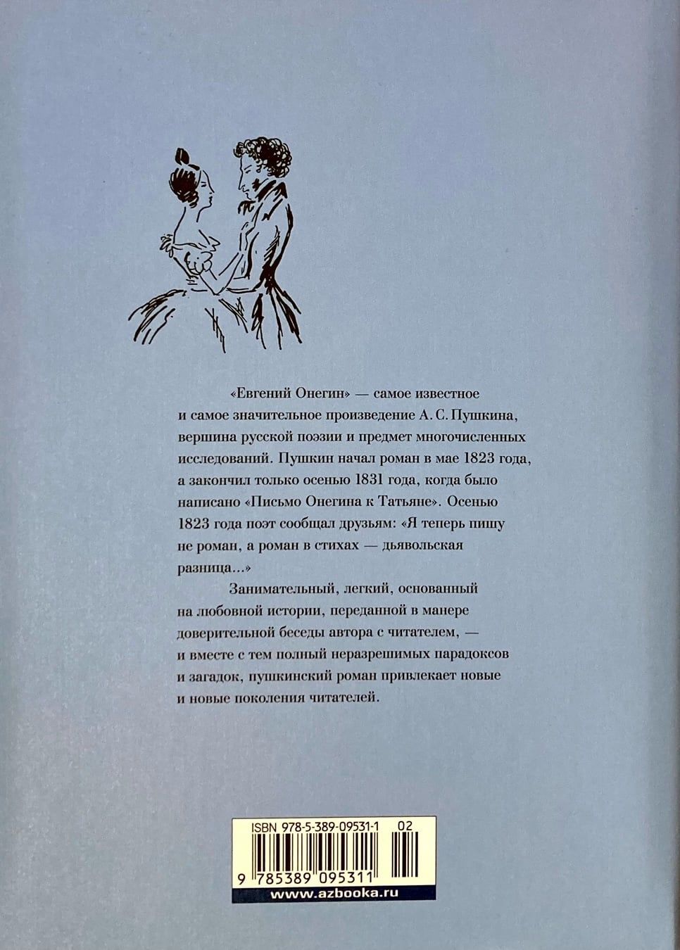 «Евгений Онегин» — самое известное и самое значительное произведение А. С. Пушкина, вершина русской поэзии и предмет многочисленных исследований. Пушкин начал роман в мае 1823 года, а закончил только осенью 1831 года, когда было написано «Письмо Онегина к Татьяне». Осенью 1823 года поэт сообщал друзьям: «Я теперь пишу не роман, а роман в стихах — дьявольская разница...» Занимательный, легкий, основанный на любовной истории, переданной в манере доверительной беседы автора с читателем, — и вместе с тем полный неразрешимых парадоксов и загадок, пушкинский роман привлекает новые и новые поколения читателей.
