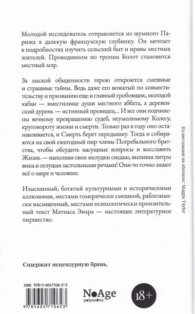 За маской обыденности герою откроются смешные и страшные тайны. Ведь даже его вожатый по совместительству и призванию еще и главный гробовщик, молодой кабан — вместилище души местного аббата, а деревенский дурень — истинный провидец... И все они подчинены вечному превращению судеб, неумолимому Колесу, круговороту жизни и смерти. Только раз в году оно останавливается, и Смерть берет передышку. Тогда и собираются на свой ежегодный пир члены Погребального братства, чтобы обсудить насущные вопросы и восславить Жизнь — наполняя свои желудки снедью, выпивая литры вина и оглушая застольными речами! Они-то точно знают всё о мире и человеке.