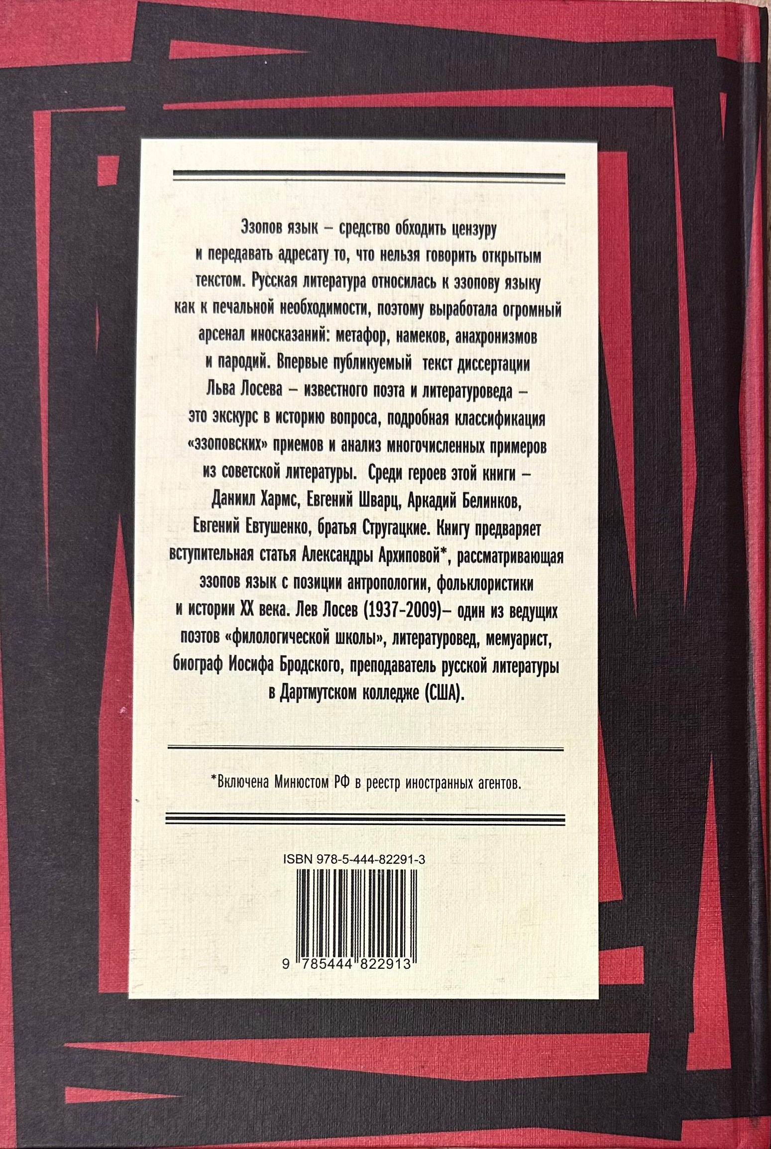 Эзопов язык — средство обходить цензуру и передавать адресату то, что нельзя говорить открытым текстом. Русская литература относилась к эзопову языку как к печальной необходимости, поэтому выработала огромный арсенал иносказаний: метафор, намёков, анахронизмов и пародий. Впервые публикуемый текст диссертации Льва Лосева — известного поэта и литературоведа — это экскурс в историю вопроса, подробная классификация «эзоповских» приёмов и анализ многочисленных примеров из советской литературы. Среди героев этой книги — Даниил Хармс, Евгений Шварц, Аркадий Белинков, Евгений Евтушенко, братья Стругацкие. Книгу предваряет вступительная статья Александры Архиповой, рассматривающая эзопов язык с позиции антропологии, фольклористики и истории XX века. Лев Лосев (1937–2009)— один из ведущих поэтов «филологической школы», литературовед, мемуарист, биограф Иосифа Бродского, преподаватель русской литературы в Дартмутском колледже (США).