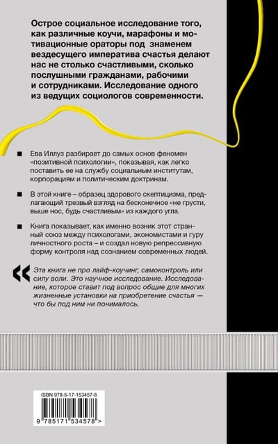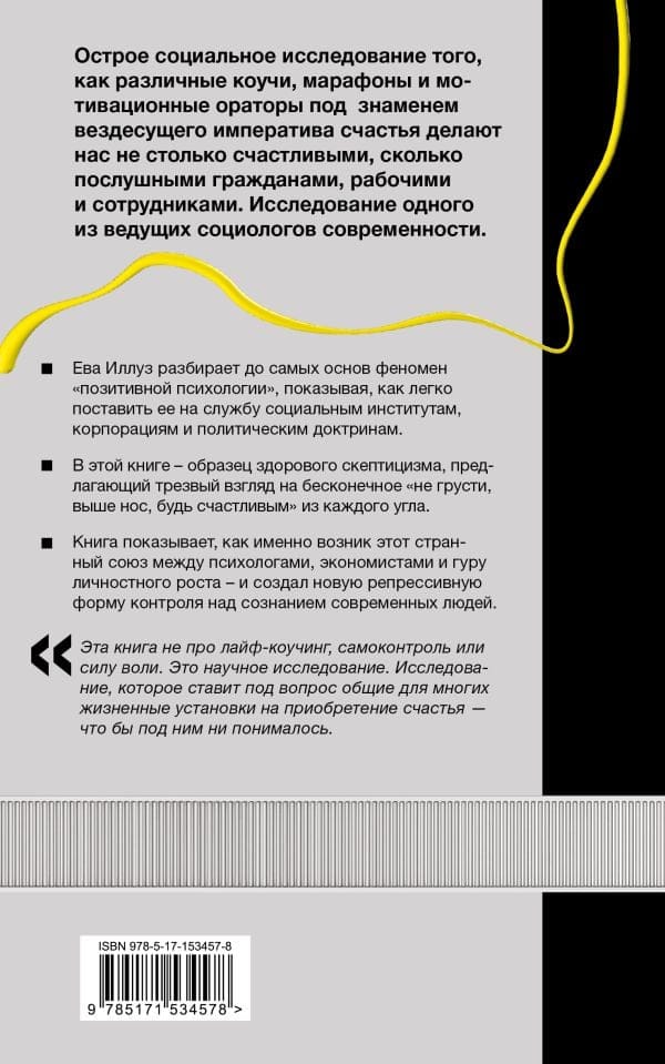 Острое социальное исследование того, как различные коучи, марафоны и мотивационные ораторы под знаменем вездесущего императива счастья делают нас не столько счастливыми, сколько послушными гражданами, рабочими и сотрудниками. Исследование одного из ведущих социологов современности. Ева Иллуз разбирает до самых основ феномен «позитивной психологии», показывая, как легко поставить ее на службу социальным институтам, корпорациям и политическим доктринам. В этой книге — образец здорового скептицизма, предлагающий трезвый взгляд на бесконечное «не грусти, выше нос, будь счастливым» из каждого угла. Книга показывает, как именно возник этот странный союз между психологами, экономистами и гуру личностного роста — и создал новую репрессивную форму контроля над сознанием современных людей.
