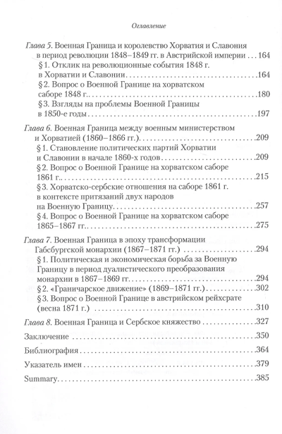 В монографии исследуется ряд проблем истории Военной Границы и королевства Хорватия и Славония в 1840-е — начале 1870-х годов — в период «национального возрождения» славянских народов под властью Габсбургов и усиления их борьбы за политическую и территориальную автономию. В центре внимания — судьба административно-территориальной единицы с особым статусом, Военной Границы, созданной в период войн с Османской империей и потерявшей стратегическое значение в XIX веке. На основе изучения широкого спектра источников (политических манифестов, публицистики, периодики, материалов заседаний хорватского сабора и австрийского рейхсрата, статистических исследований и др.) анализируются политическая борьба вокруг статуса и принадлежности Военной Границы, отношение хорватских политиков к включению в состав королевства новых территорий, а также представителей Военной Границы — к предстоящим изменениям. Рассмотрены основные проекты реформирования или упразднения института Военной Границы в период революции 1848–1849 годов в Австрийской империи и политической трансформации монархии Габсбургов (1860–1871 годы). Представлен контекст влияния автономного Сербского княжества на население Военной Границы в рамках сербско-австрийских и сербско-хорватских отношений.