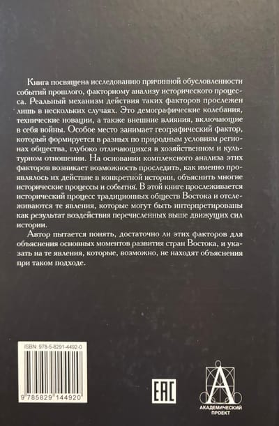 Книга посвящена исследованию причинной обусловленности событий прошлого, факторному анализу исторического процесса. Реальный механизм действия таких факторов прослежен лишь в нескольких случаях. Это демографические колебания, технические новации, а также внешние влияния, включающие в себя войны. Особое место занимает географический фактор, который формируется в разных по природным условиям регионах общества, глубоко отличающихся в хозяйственном и культурном отношении. На основании комплексного анализа этих факторов возникает возможность проследить, как именно проявлялось их действие в конкретной истории, объяснить многие исторические процессы и события. В этой книге прослеживается исторический процесс традиционных обществ Востока и отслеживаются те явления, которые могут быть интерпретированы как результат воздействия перечисленных выше движущих сил истории. Автор пытается понять, достаточно ли этих факторов для объяснения основных моментов развития стран Востока, и указать на те явления, которые, возможно, не находят объяснения при таком подходе. Издание адресовано специалистам-историкам, аспирантам и студентам вузов.