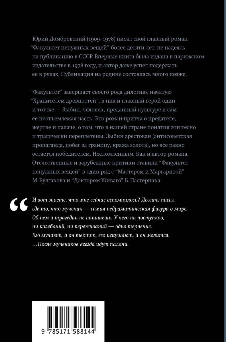 Юрий Домбровский (1909–1978) писал свой главный роман «Факультет ненужных вещей» более десяти лет, не надеясь на публикацию в СССР. Впервые книга была издана в парижском издательстве в 1978 году, и автор даже успел подержать ее в руках. Публикация на родине состоялась много позже.