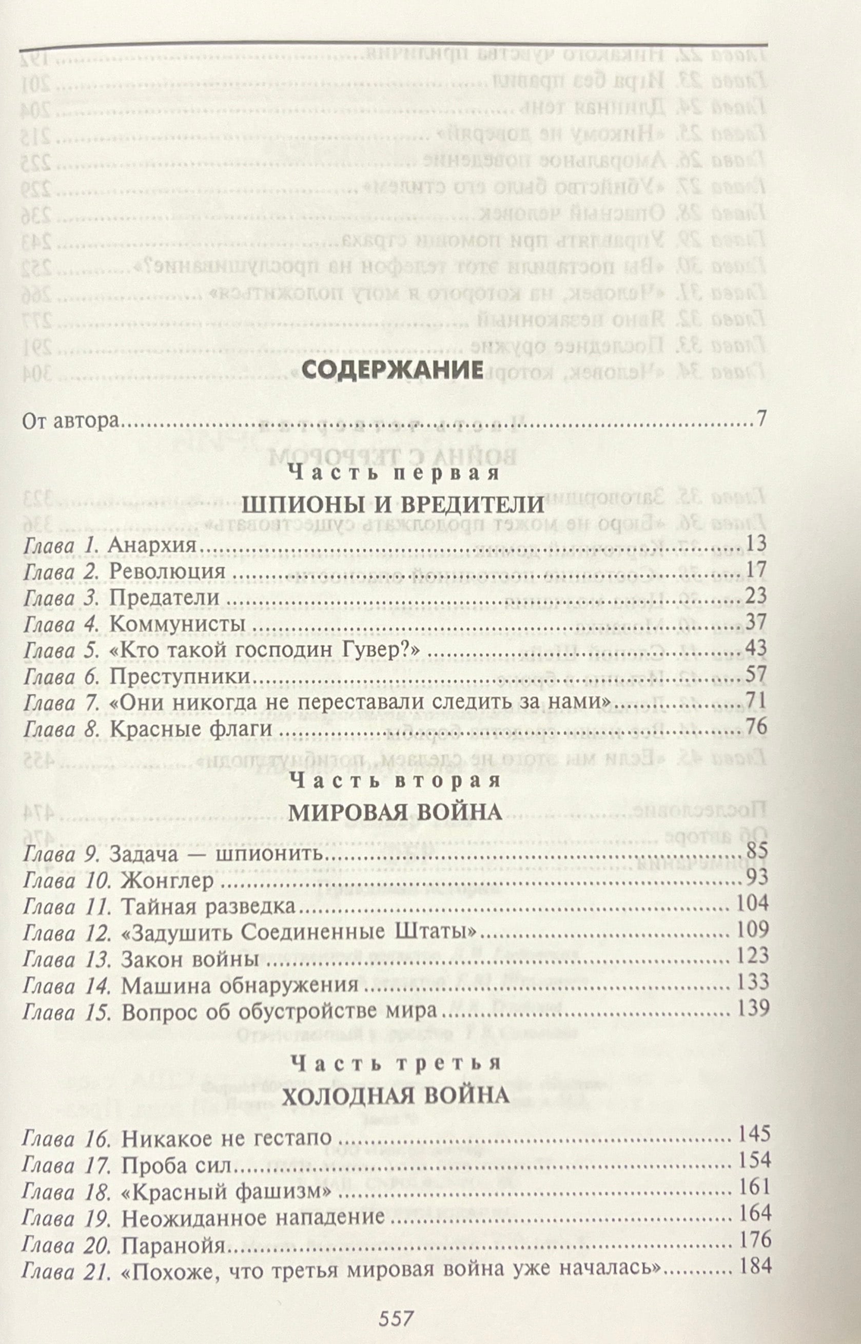 Рассказывает, как создавалась и совершенствовалась агентурная сеть. Как Гувер выполнял  почти немыслимые задания: осуществлял слежку за руководителями Советского Союза и Китая в самый мрачный период холодной войны, контролировал государственные перевороты против демократически избранных лидеров иностранных государств, искусно дестабилизировал положение президентов Соединенных Штатов. Как вел политическую войну и управлял государственными делами в целях национальной безопасности, зачастую действуя в ущерб морали.
