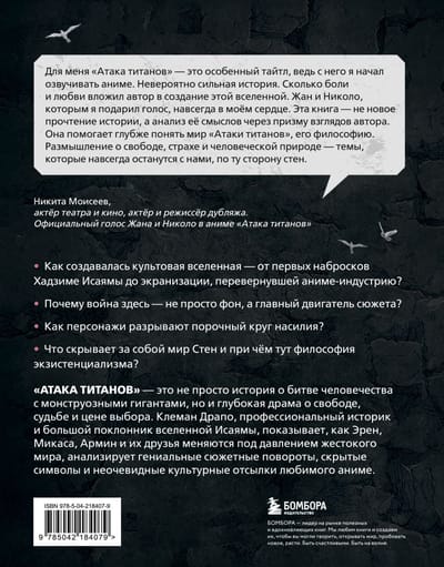 Клеман Драпо, профессиональный историк и большой поклонник творчества Исаямы, предлагает нам вновь погрузиться в историю культовой вселенной с помощью своей книги «Феномен аниме «Атака титанов»: история, отсылки и скрытые смыслы культовой вселенной» и узнать:
