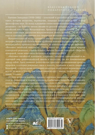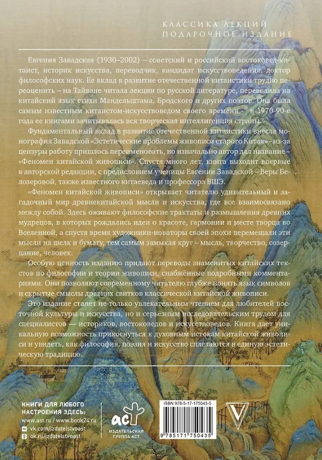 «Феномен китайской живописи» открывает читателю удивительный и загадочный мир древнекитайской мысли и искусства. Здесь оживают философские трактаты и размышления древних мудрецов, в которых рождались идеи о красоте, гармонии и месте человека во Вселенной, а спустя время художники-новаторы своей эпохи воплощали эти мысли на шёлк и бумагу, тем самым замыкая круг – мысль, творчество, созерцание, человек. Особую ценность изданию придают переводы знаменитых китайских текстов по философии и теории живописи, снабжённые подробными комментариями. Они позволяют современному читателю глубже понять язык символов и скрытые смыслы древних свитков традиционной китайской живописи. Это издание станет не только увлекательным чтением для любителей восточной культуры и искусства, но и серьёзным исследовательским трудом для специ- алистов — историков, востоковедов, искусствоведов и культурологов. Книга дает уникальную возможность прикоснуться к духовным истокам китайской живописи и увидеть, как философия, поэзия и искусство сплетаются в единую эстетическую традицию.