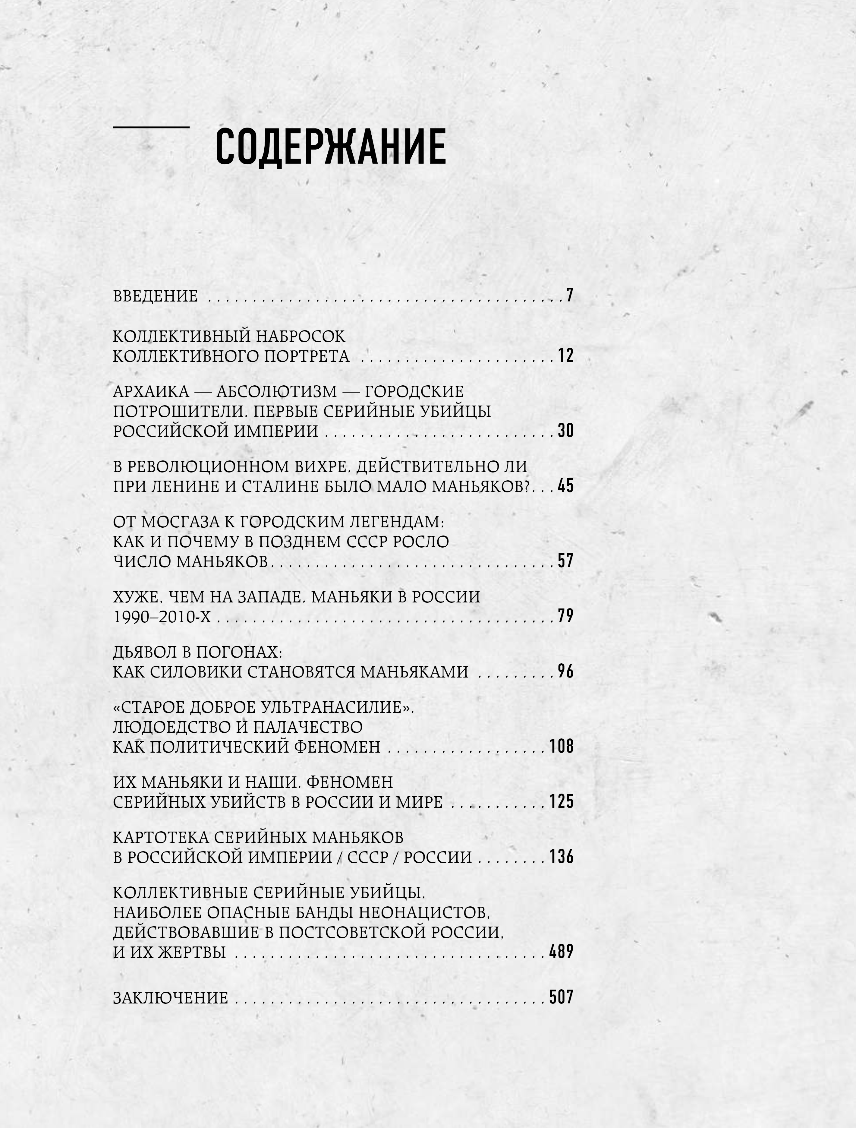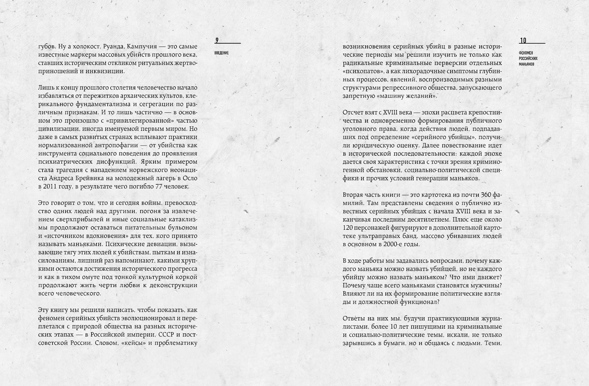 Написанная журналистом-криминологом Ириной Капитановой и журналистом-историком Антуаном Кассом книга-феномен объясняет, как социальные, культурные и политические факторы могут влиять на количество и почерк преступлений. Опираясь на архивные материалы из музеев, личные дела убийц, записи допросов и интервью с известными криминологами, психиатрами, бывшими и настоящими сотрудниками правоохранительных органов, которые лично участвовали в поимке преступников, авторы проводят параллели между западными и российскими убийцами.