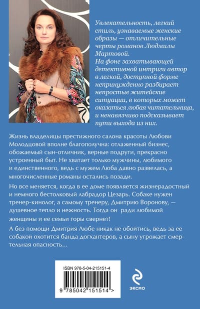 Жизнь владелицы престижного салона красоты Любови Молодцовой вполне благополучна: отлаженный бизнес, обожаемый сын-отличник, верные подруги, прекрасно устроенный быт. Не хватает только мужчины, любимого и единственного, ведь с мужем Люба давно развелась, а многочисленные романы остались позади. Но все меняется, когда в ее доме появляется жизнерадостный и немного бестолковый лабрадор Цезарь. Собаке нужен тренер-кинолог, а самому тренеру, Дмитрию Воронову, — душевное тепло и нежность. Тогда он ради любимой женщины и ее семьи горы свернет! А без помощи Дмитрия Любе никак не обойтись, ведь за ее собакой охотится банда догхантеров, а сыну угрожает смертельная опасность…