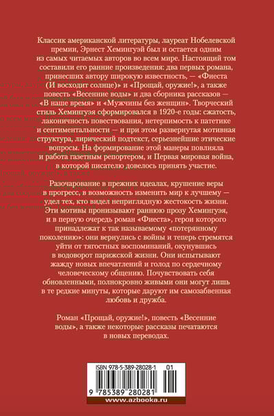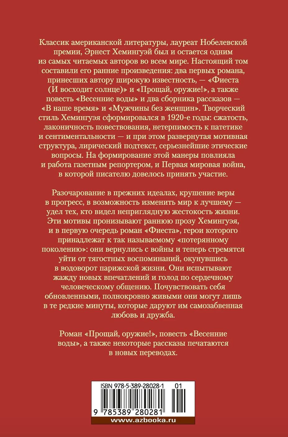 Классик американской литературы, лауреат Нобелевской премии, Эрнест Хемингуэй был и остается одним из самых читаемых авторов во всем мире. Настоящий том составили его ранние произведения: два первых романа, принесших автору широкую известность, — «Фиеста (И восходит солнце)» и «Прощай, оружие!», а также повесть «Весенние воды» и два сборника рассказов — «В наше время» и «Мужчины без женщин».